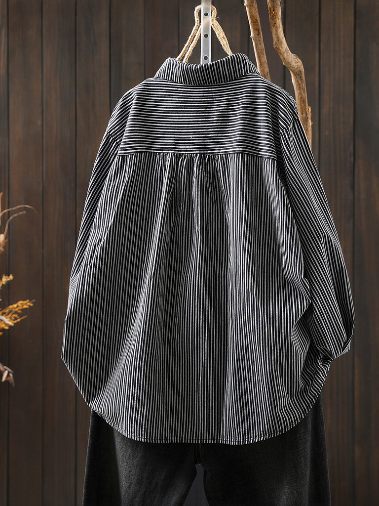 Women Autumn Stripe Turn-down Collar 100%Cotton Shirt