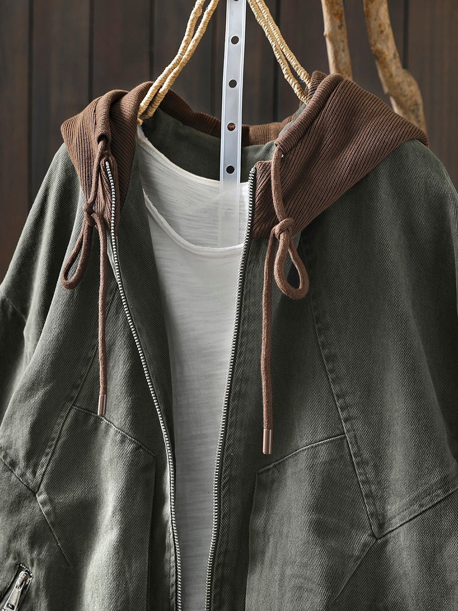 Women Spring Retro Colorblock Cotton Hooded Jacket