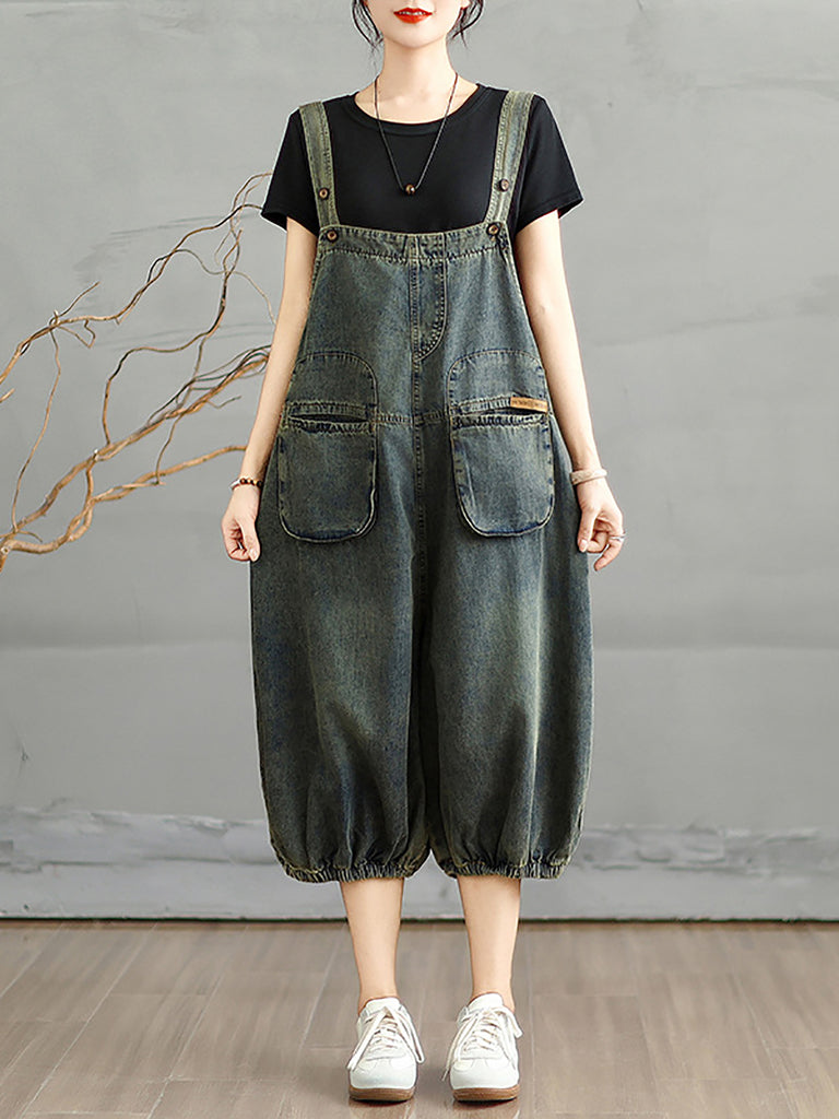 Women Summer Worn Pure Color Denim Cropped Jumpsuits