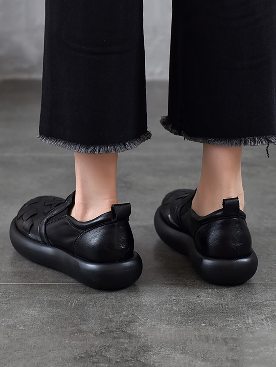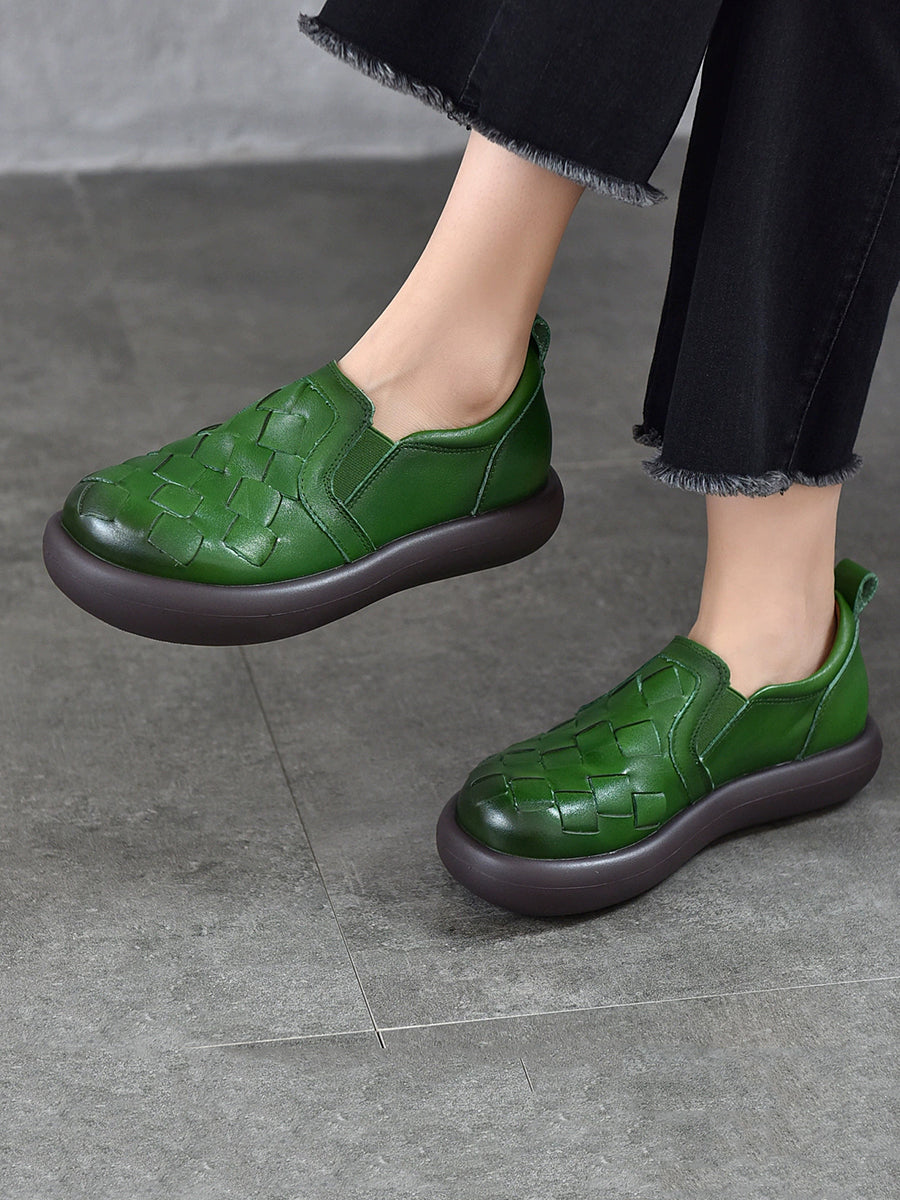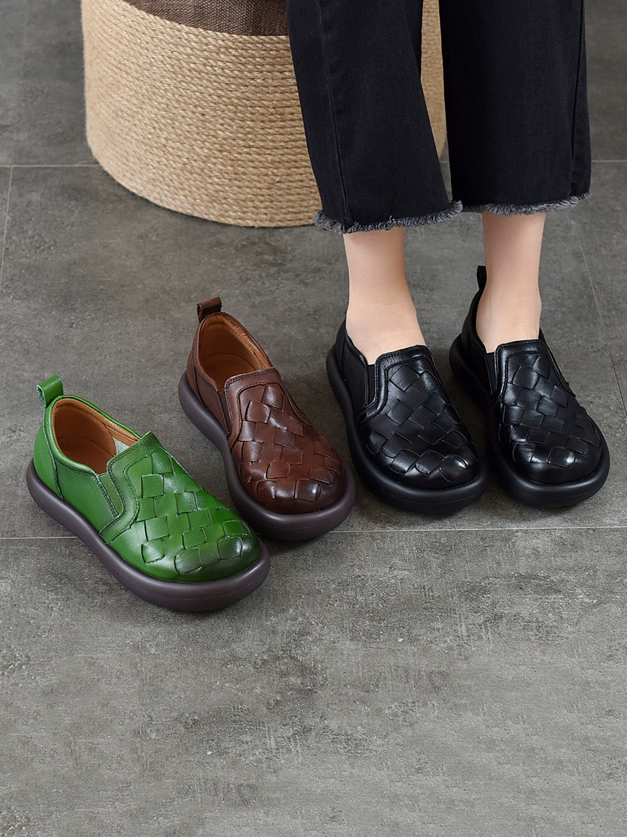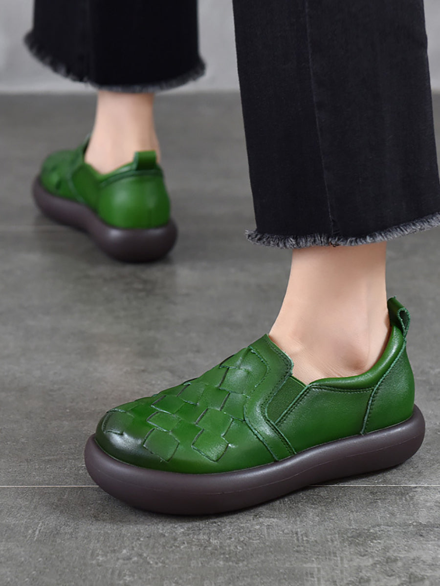 Women Spring Casual Genuine Leather Weave Flat Shoes