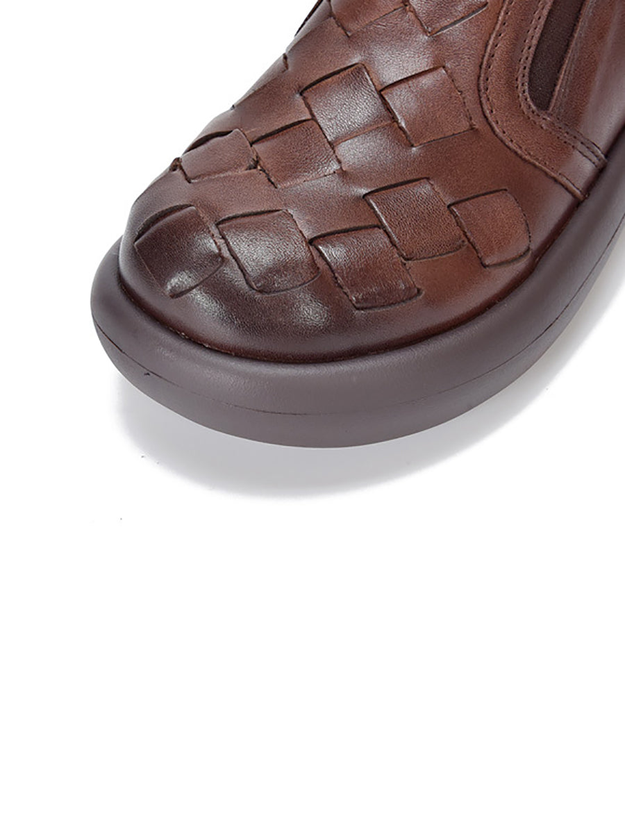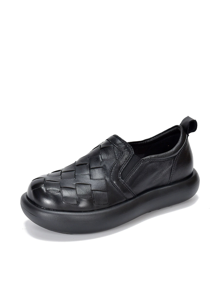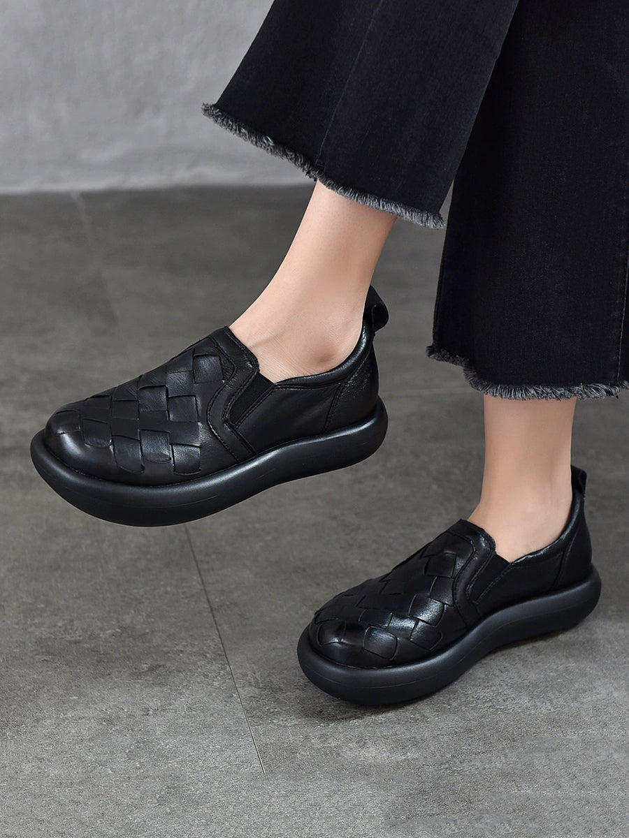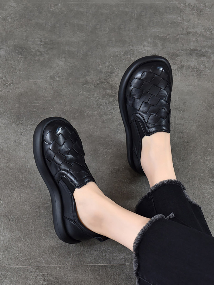 Women Spring Casual Genuine Leather Weave Flat Shoes