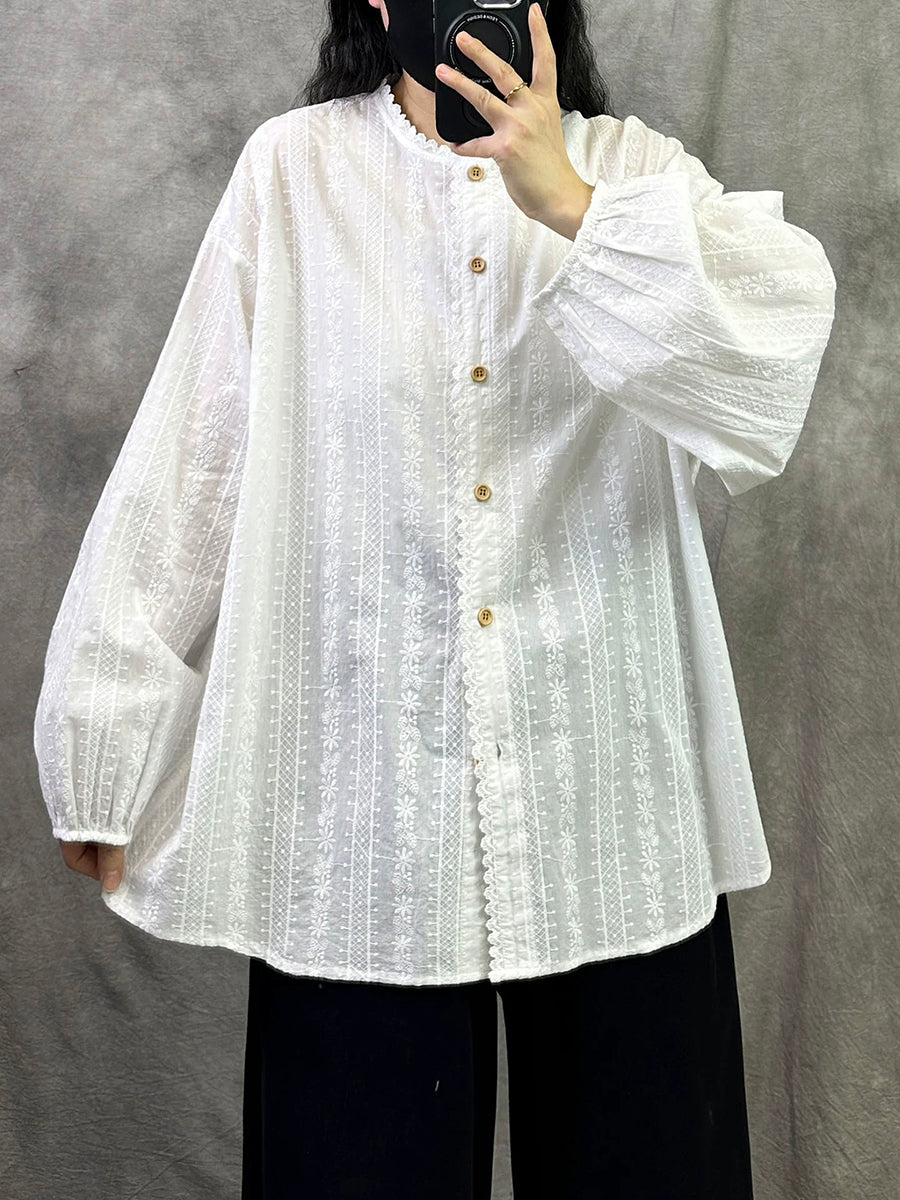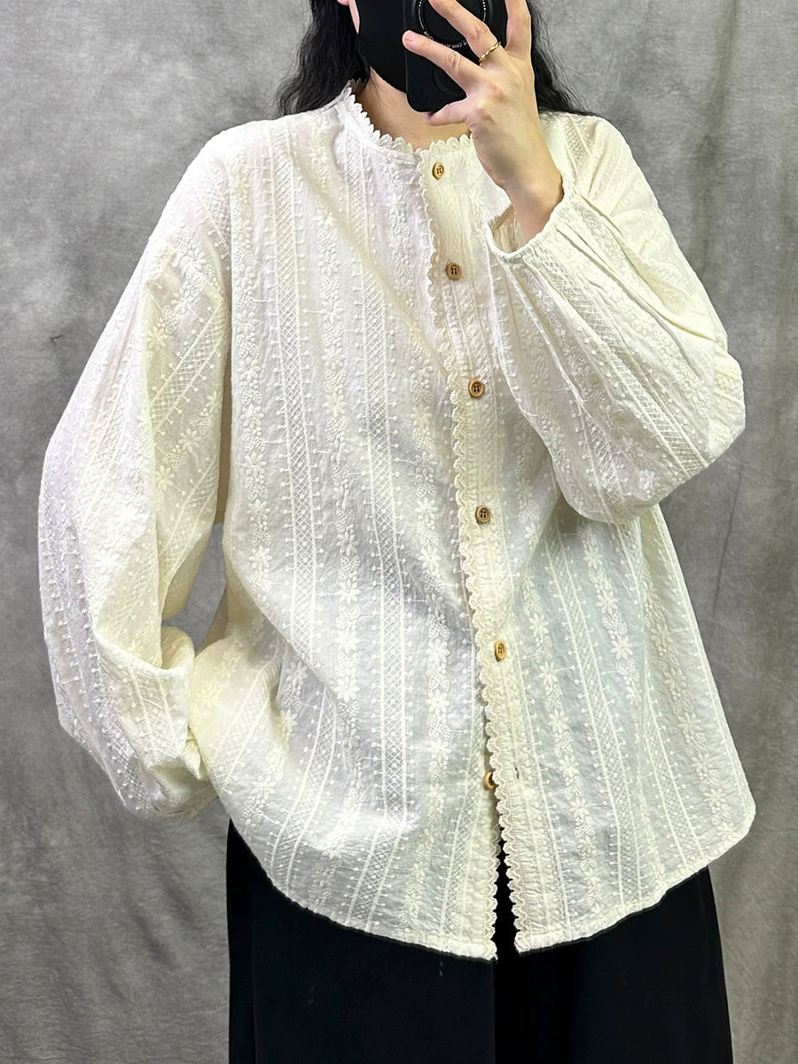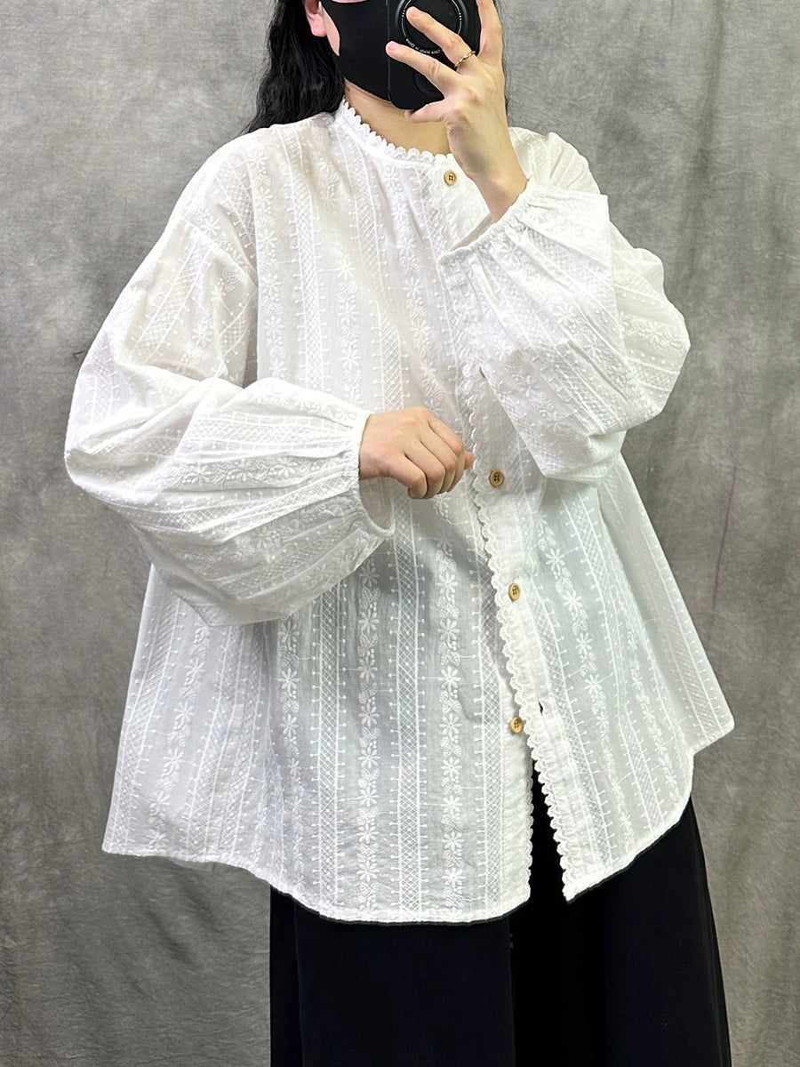 Women Spring Artsy Embroidery Cotton Stand Collar Shirt