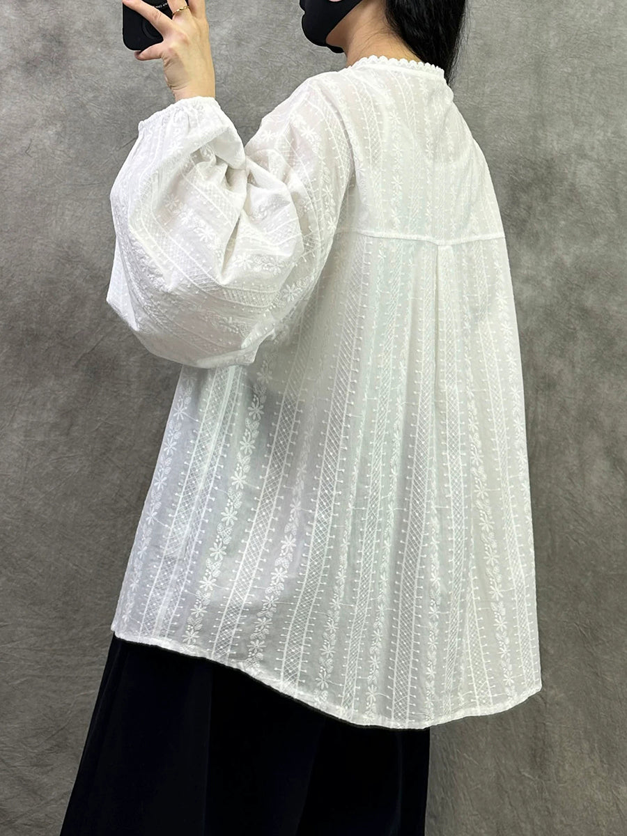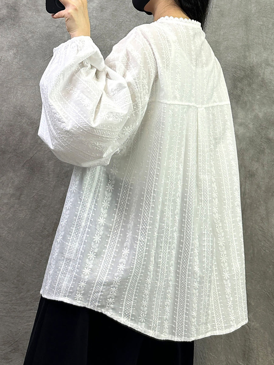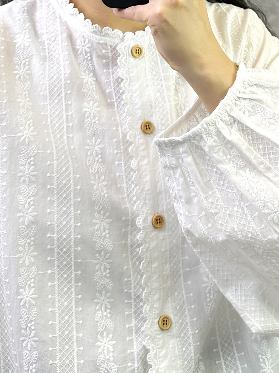 Women Spring Artsy Embroidery Cotton Stand Collar Shirt