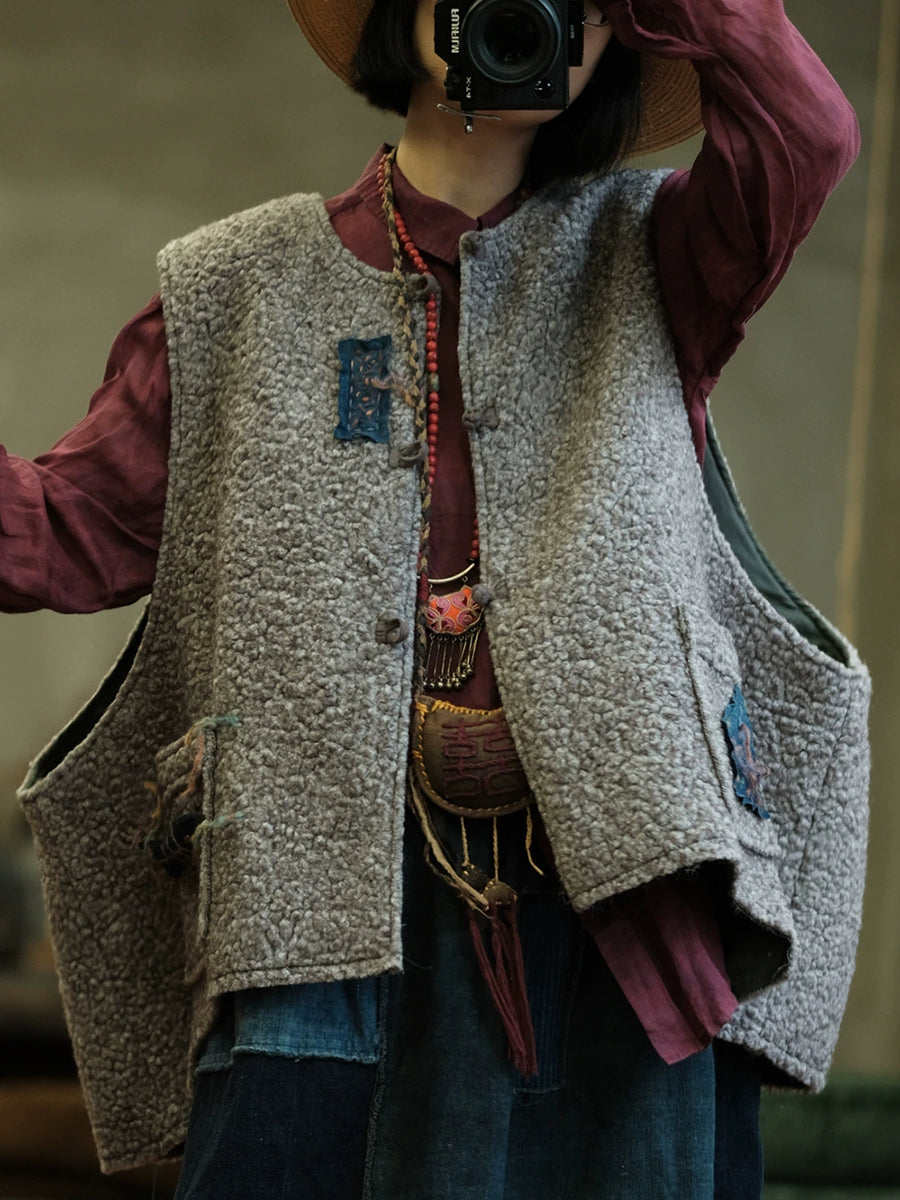 Women Winter Vintage Patch Fleece O-Neck Vest