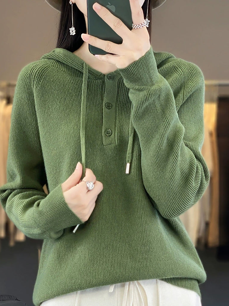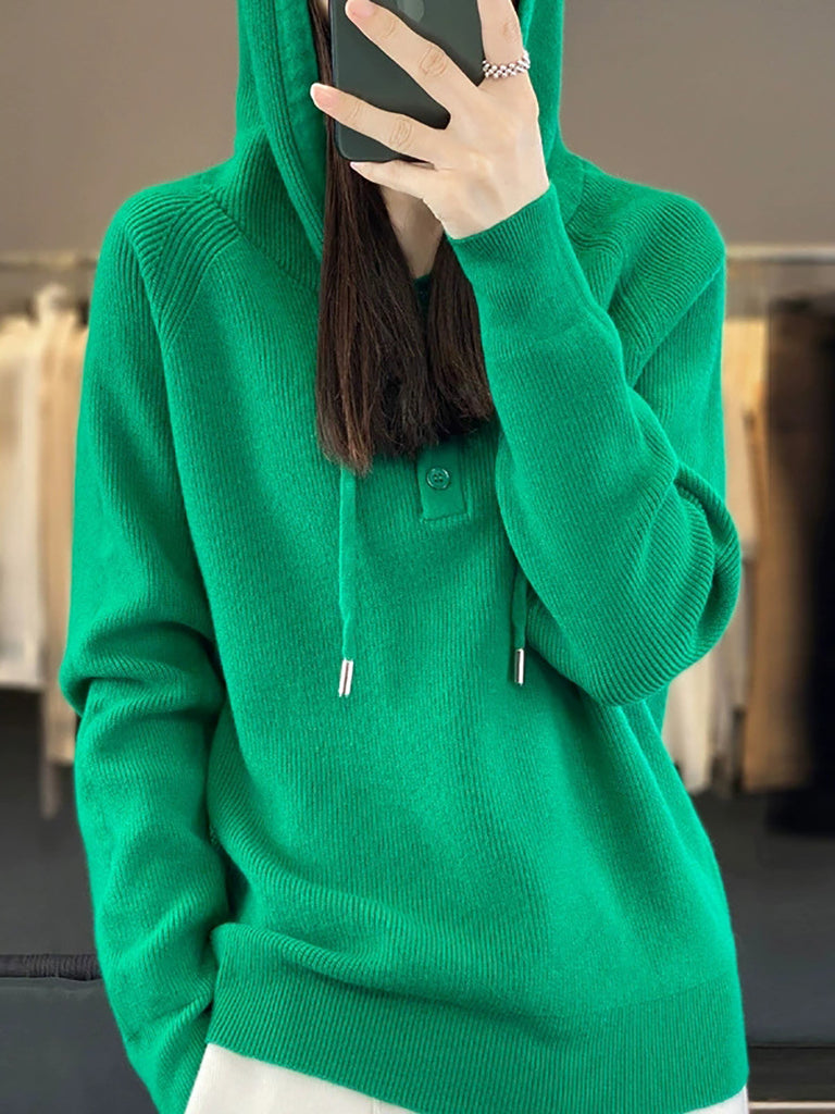 Women Autumn Casual Pure Color Knitted Hooded Sweater