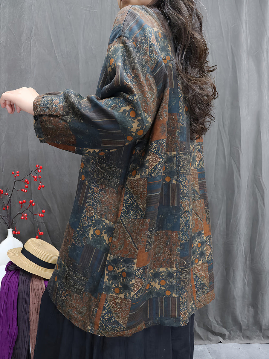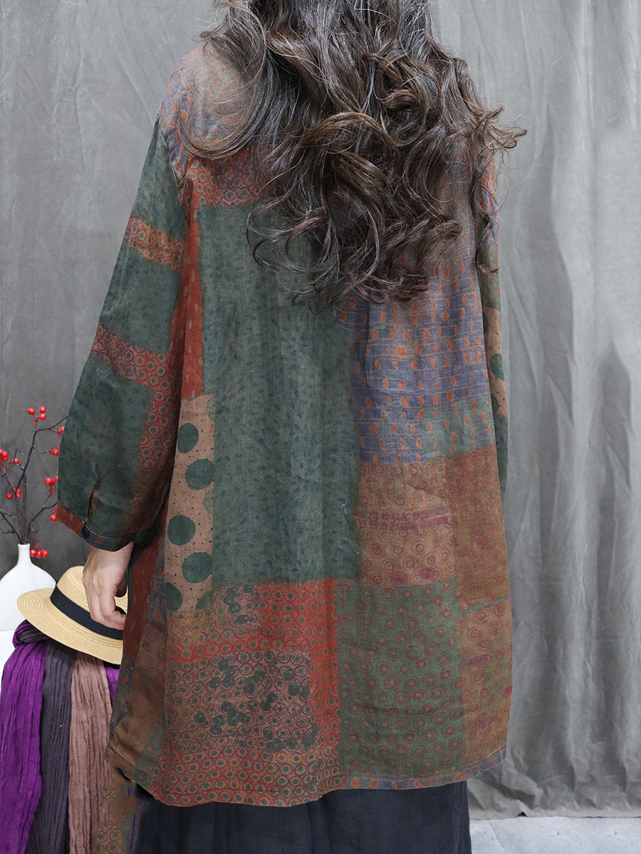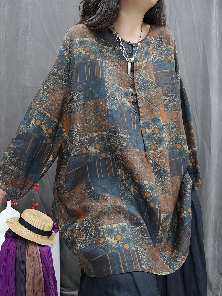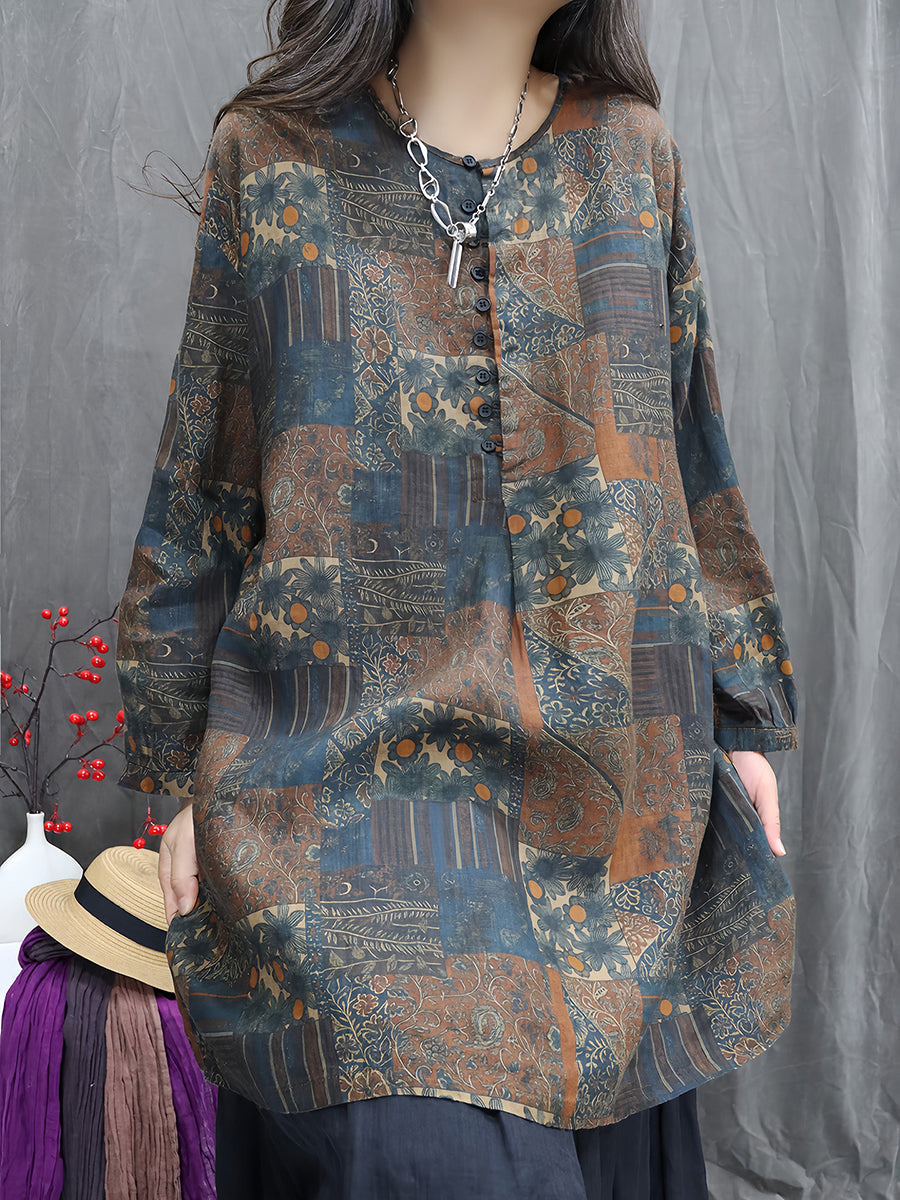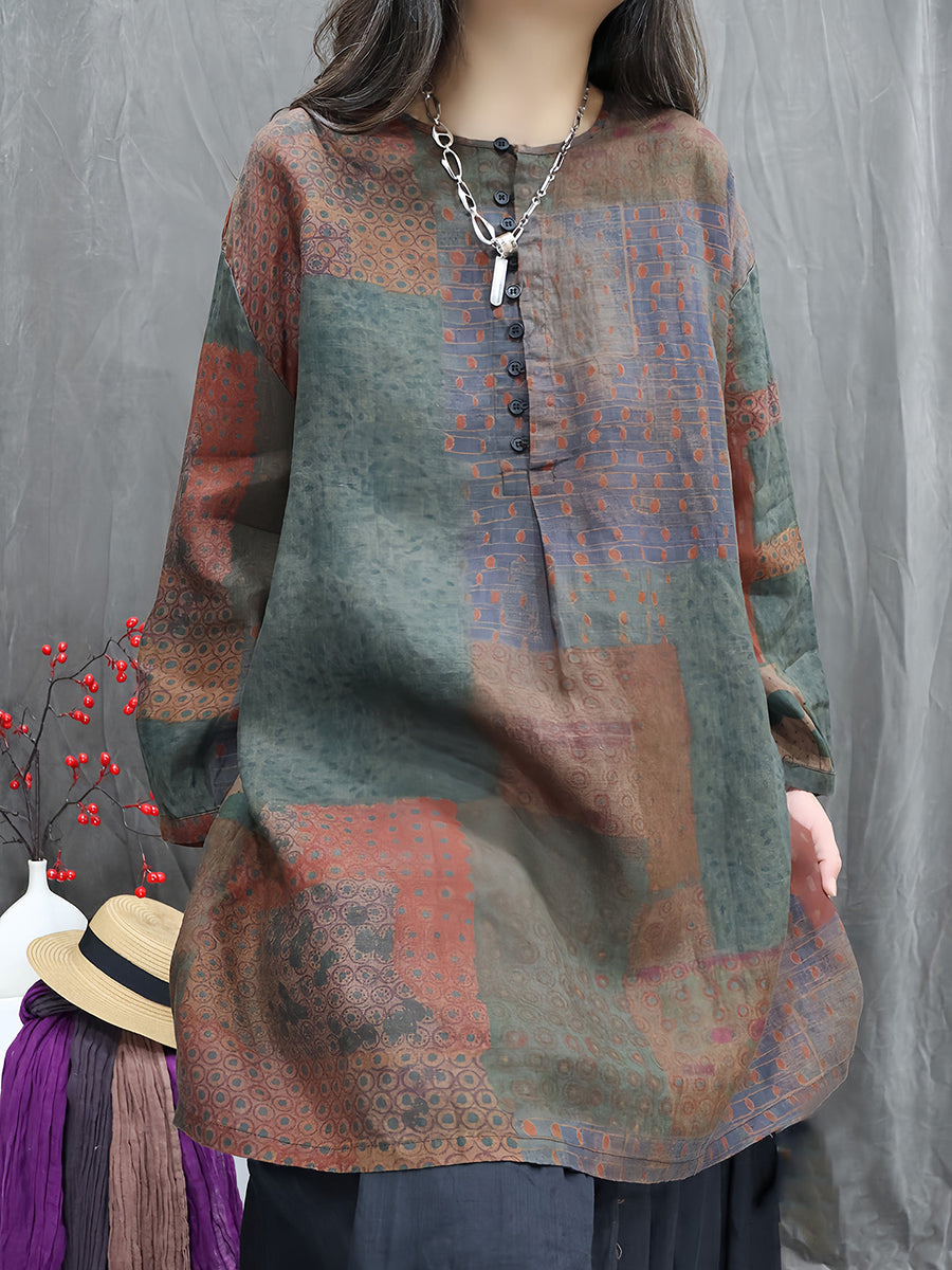 Women Artsy Autumn Patchwork O-Neck 100%Linen Blouse