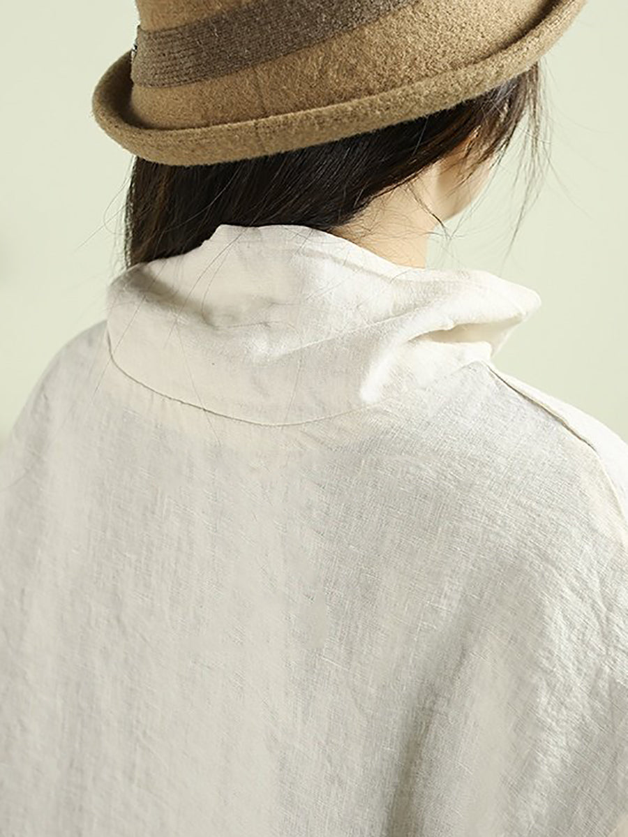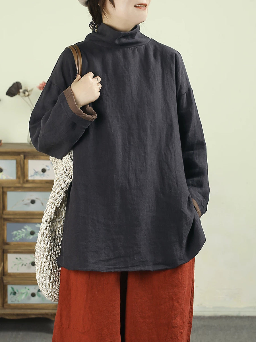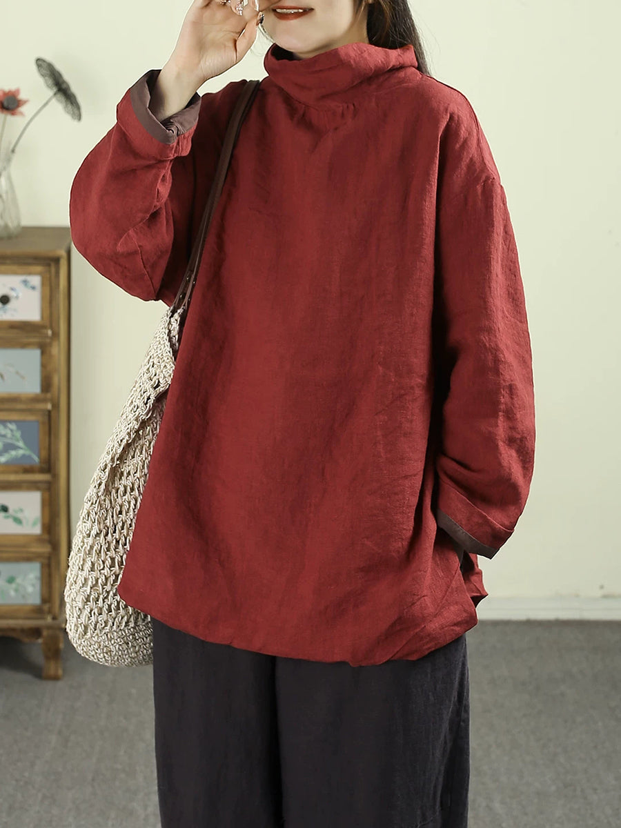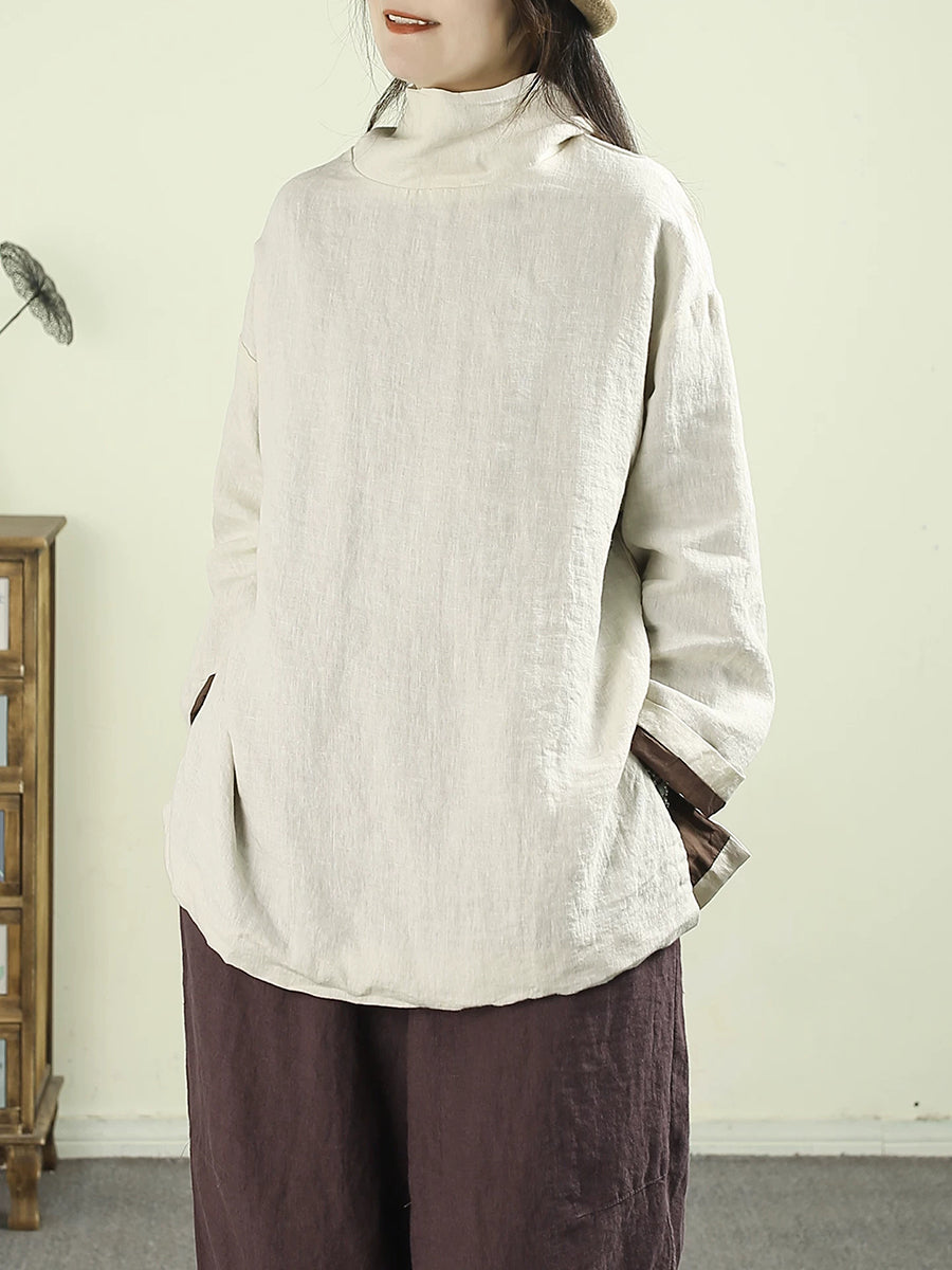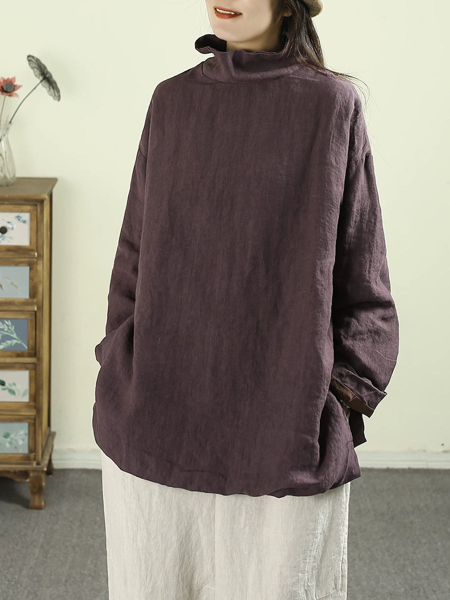 Women Artsy Pure Color Turtleneck 100%Linen Hoodie