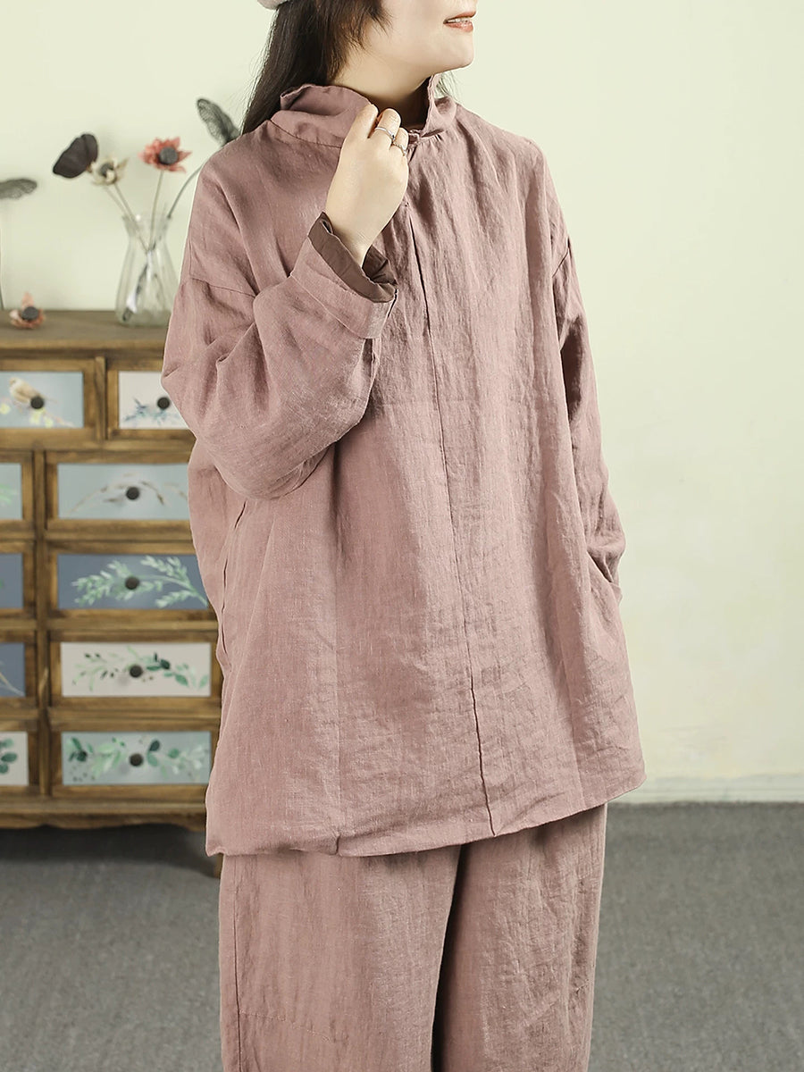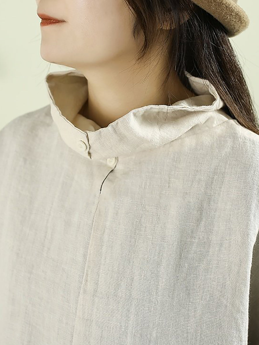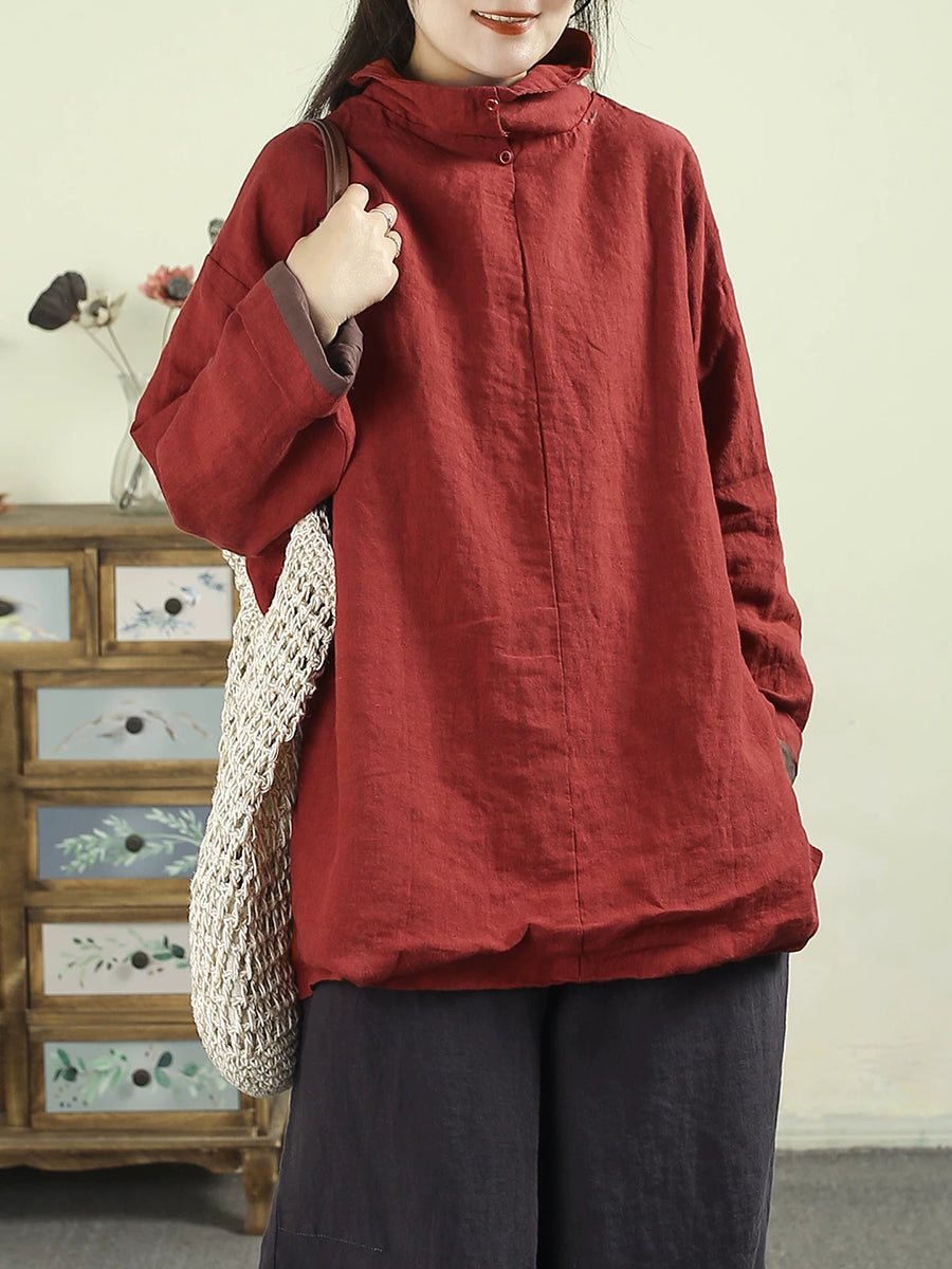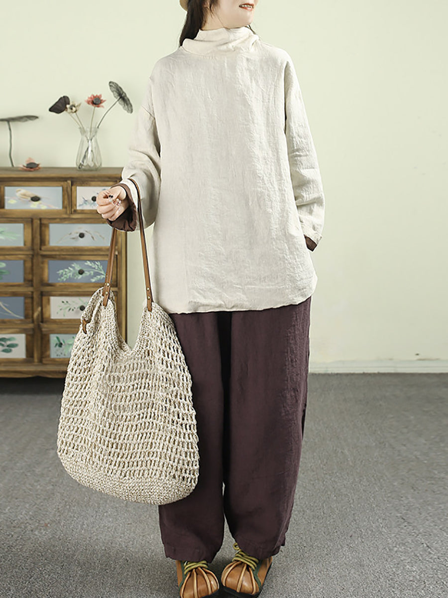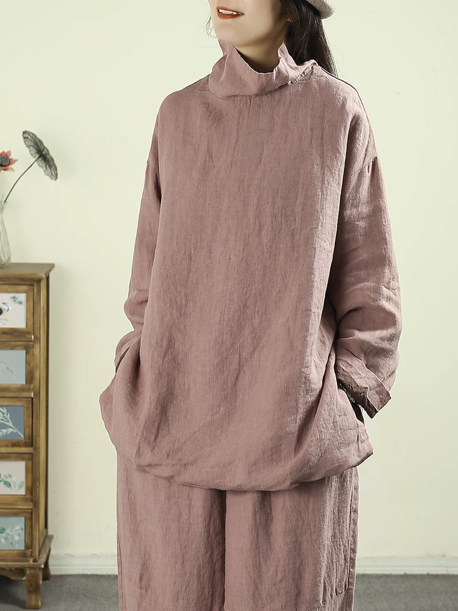 Women Artsy Pure Color Turtleneck 100%Linen Hoodie