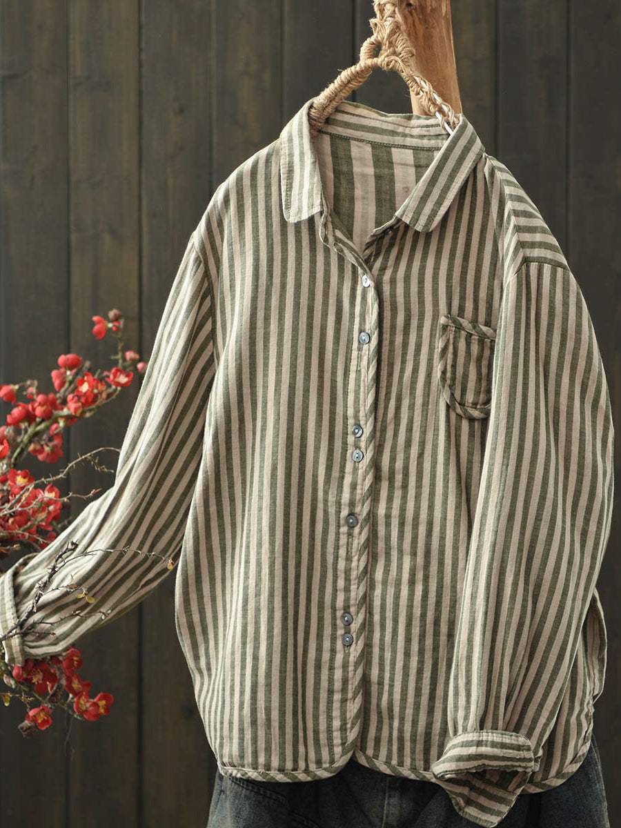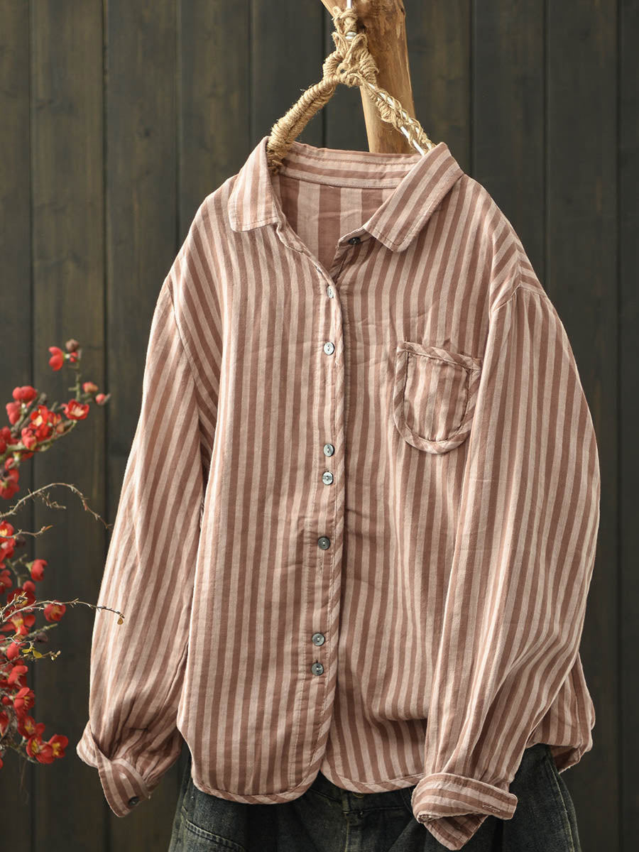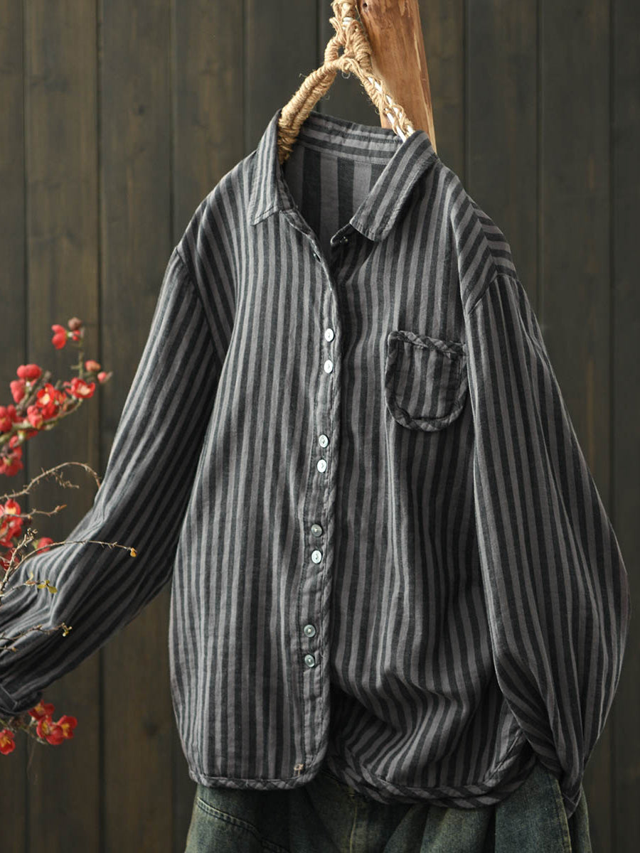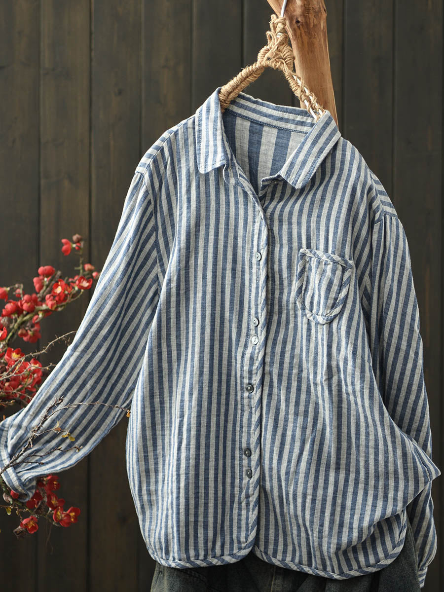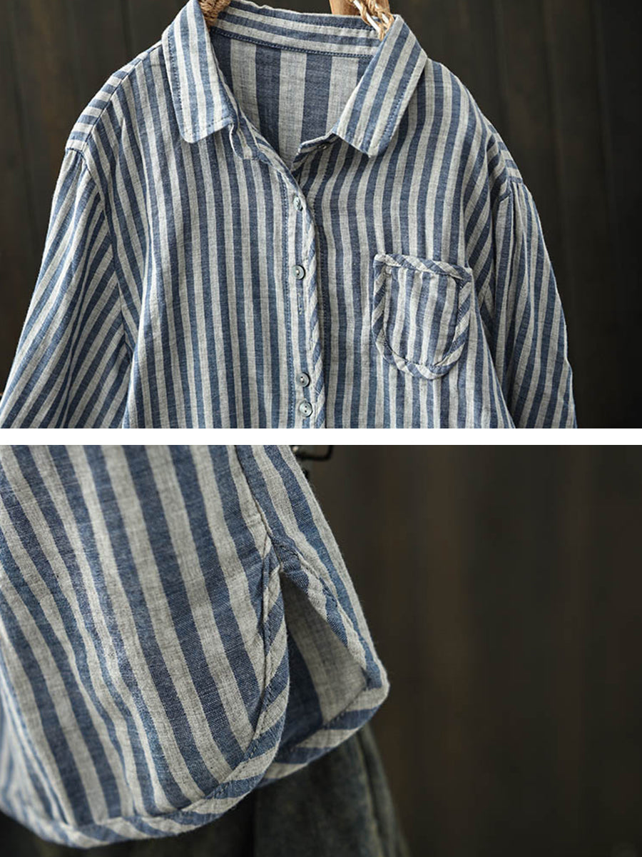 Women Autumn Stripe Turn-down Collar Cotton Shirt