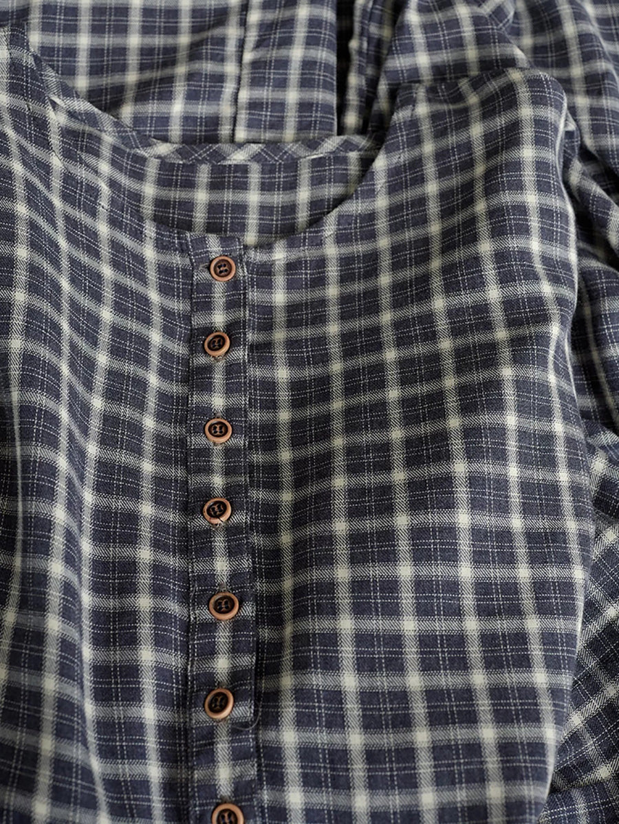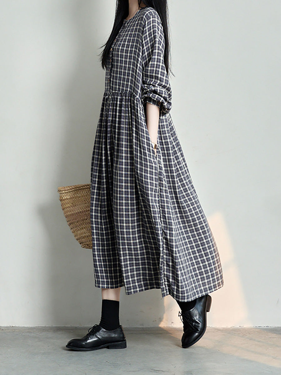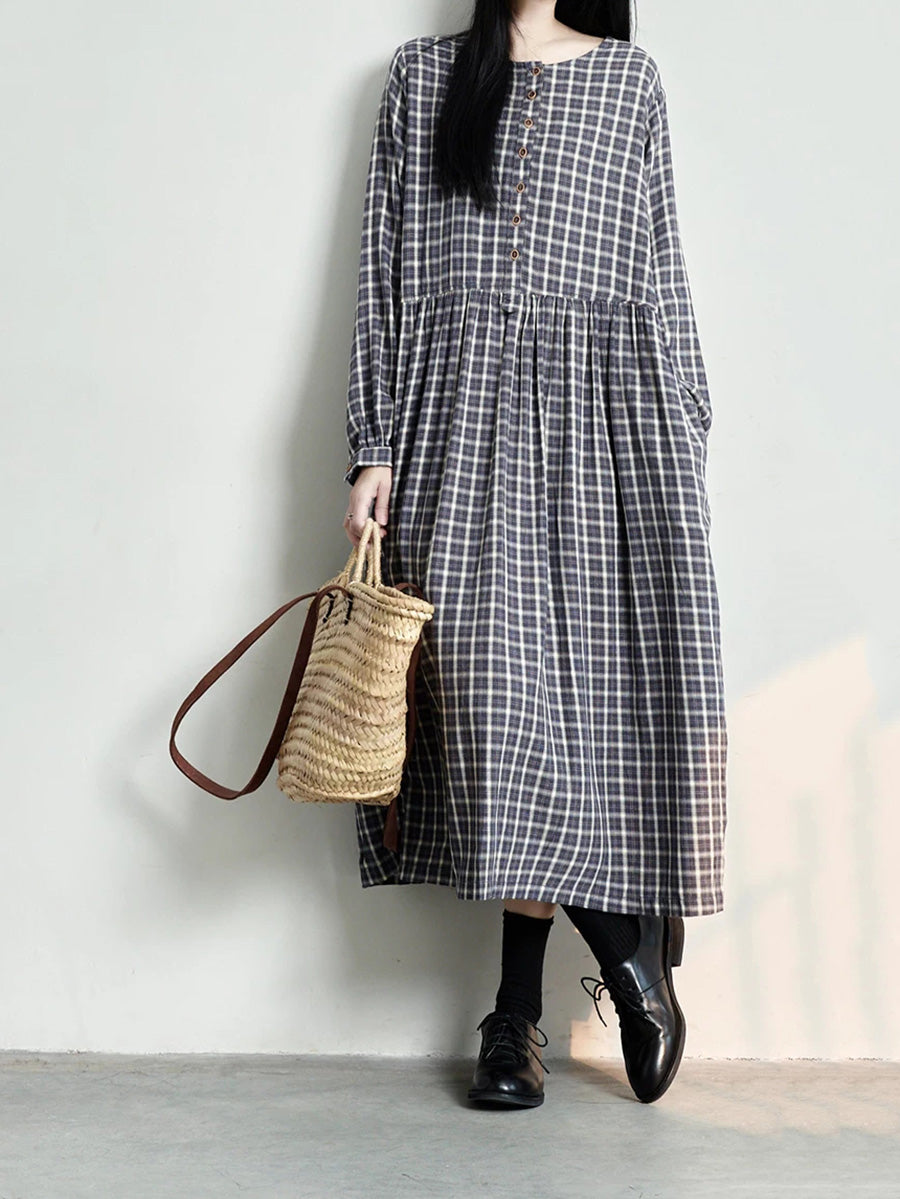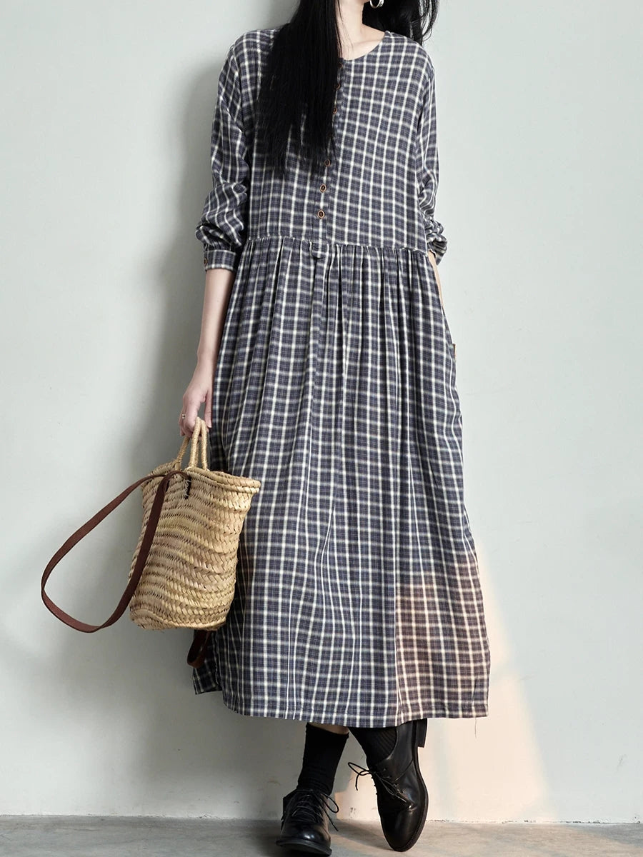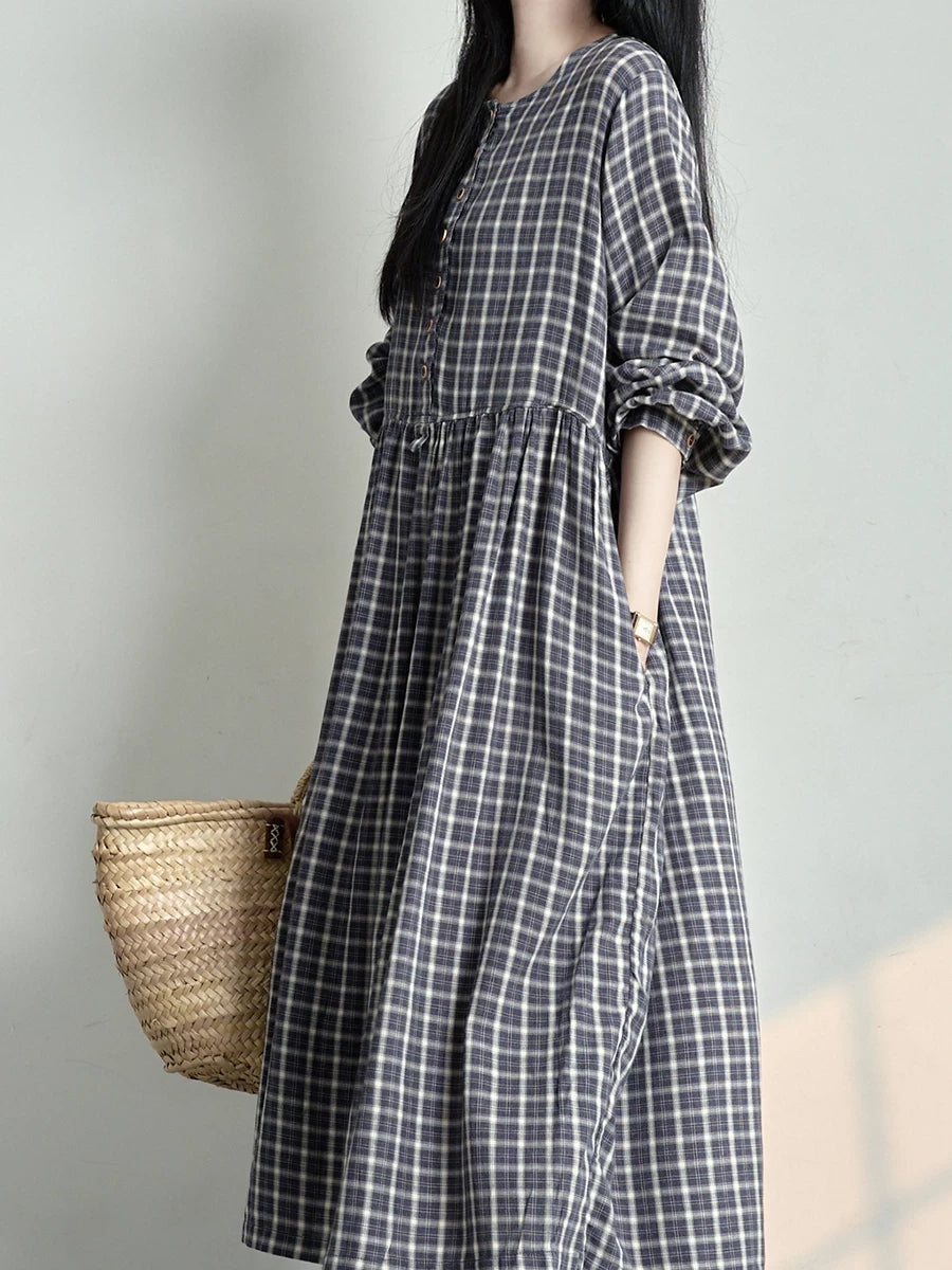 Women Spring Vintage Plaid O-Neck Dress