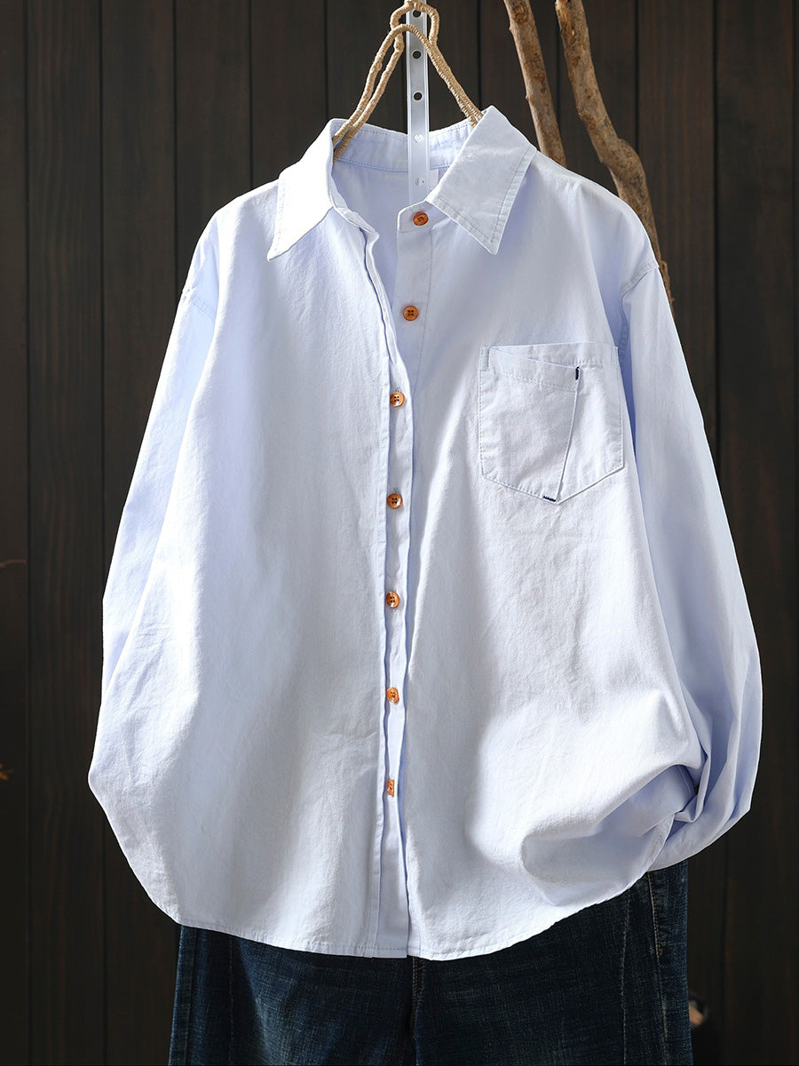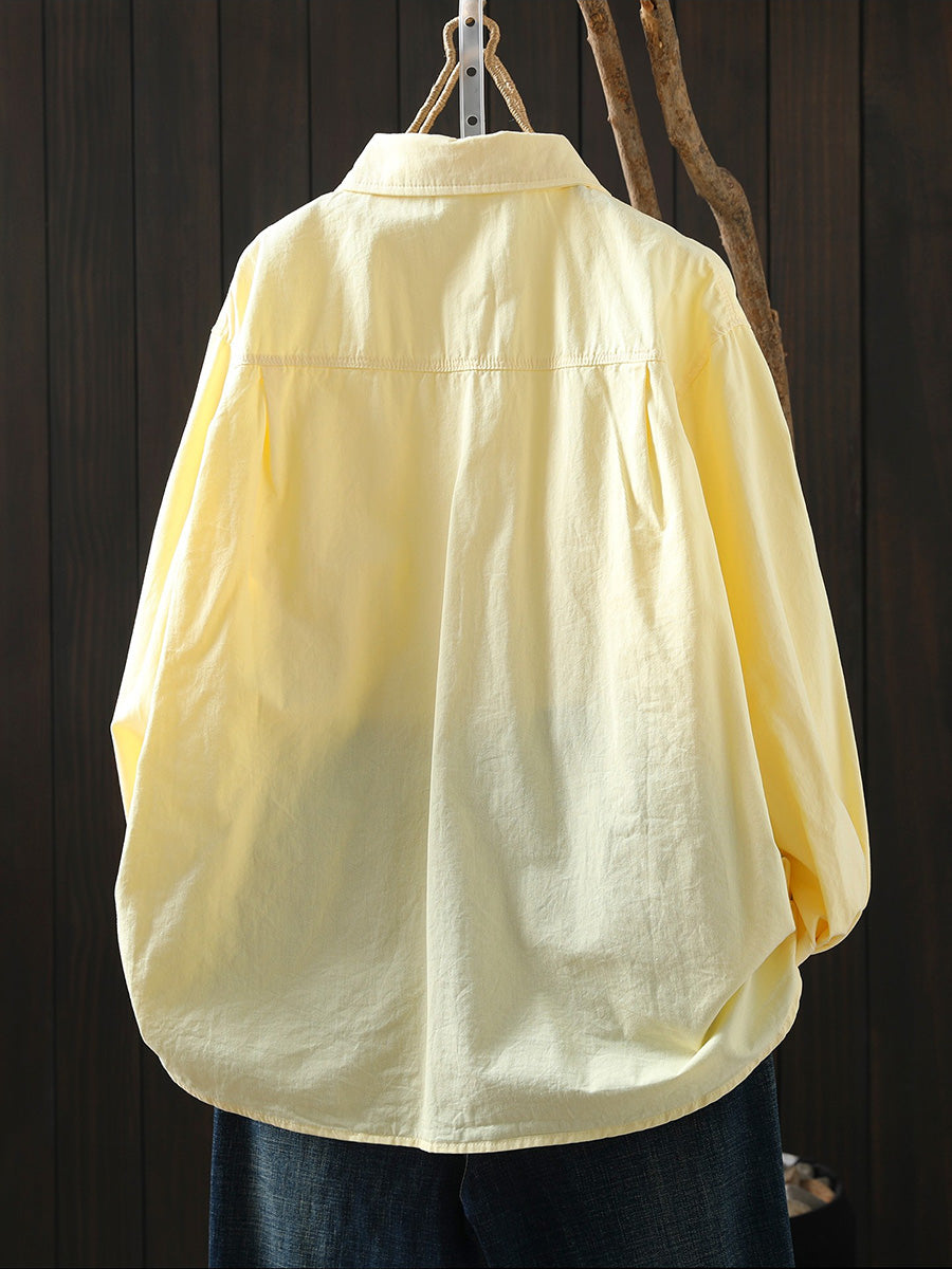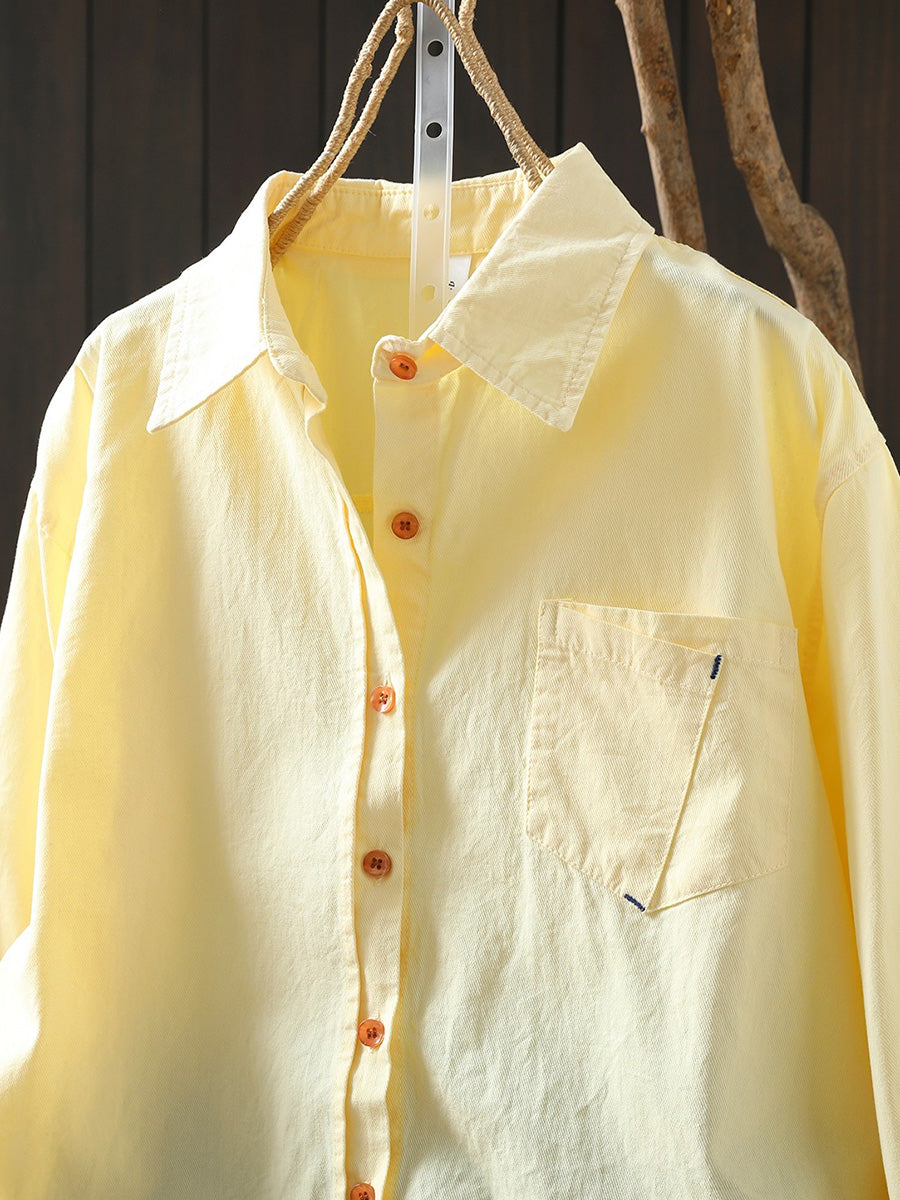 Women Artsy Spring Pure Color 100%Cotton Turn-down Collar Shirt