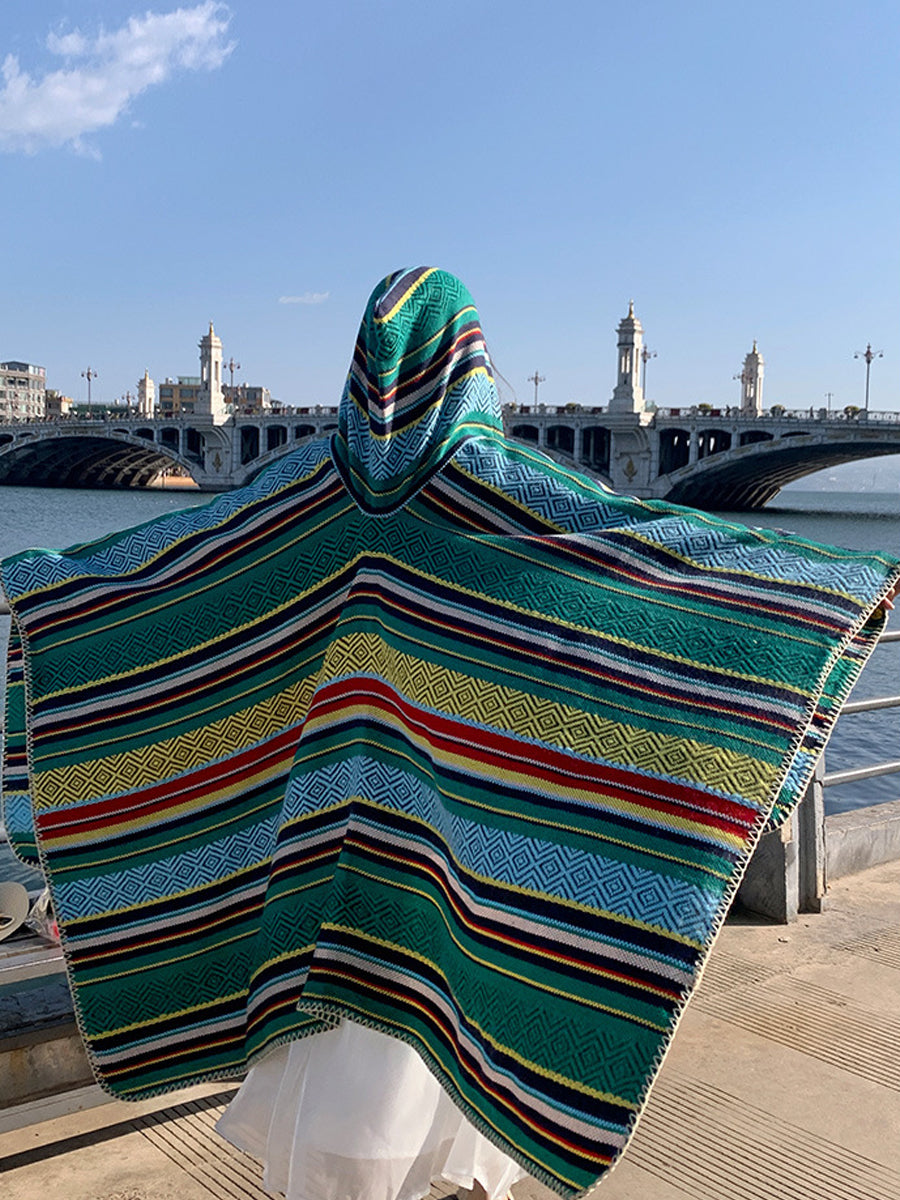 Women Autumn Ethnic Stripe Warm Shawl Hooded Scarf