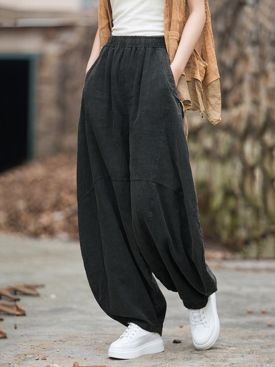 These retro-styled harem pants feature an elastic waist and a solid pattern. With a full length design and convenient pockets, they are perfect for colder seasons such as autumn and winter.