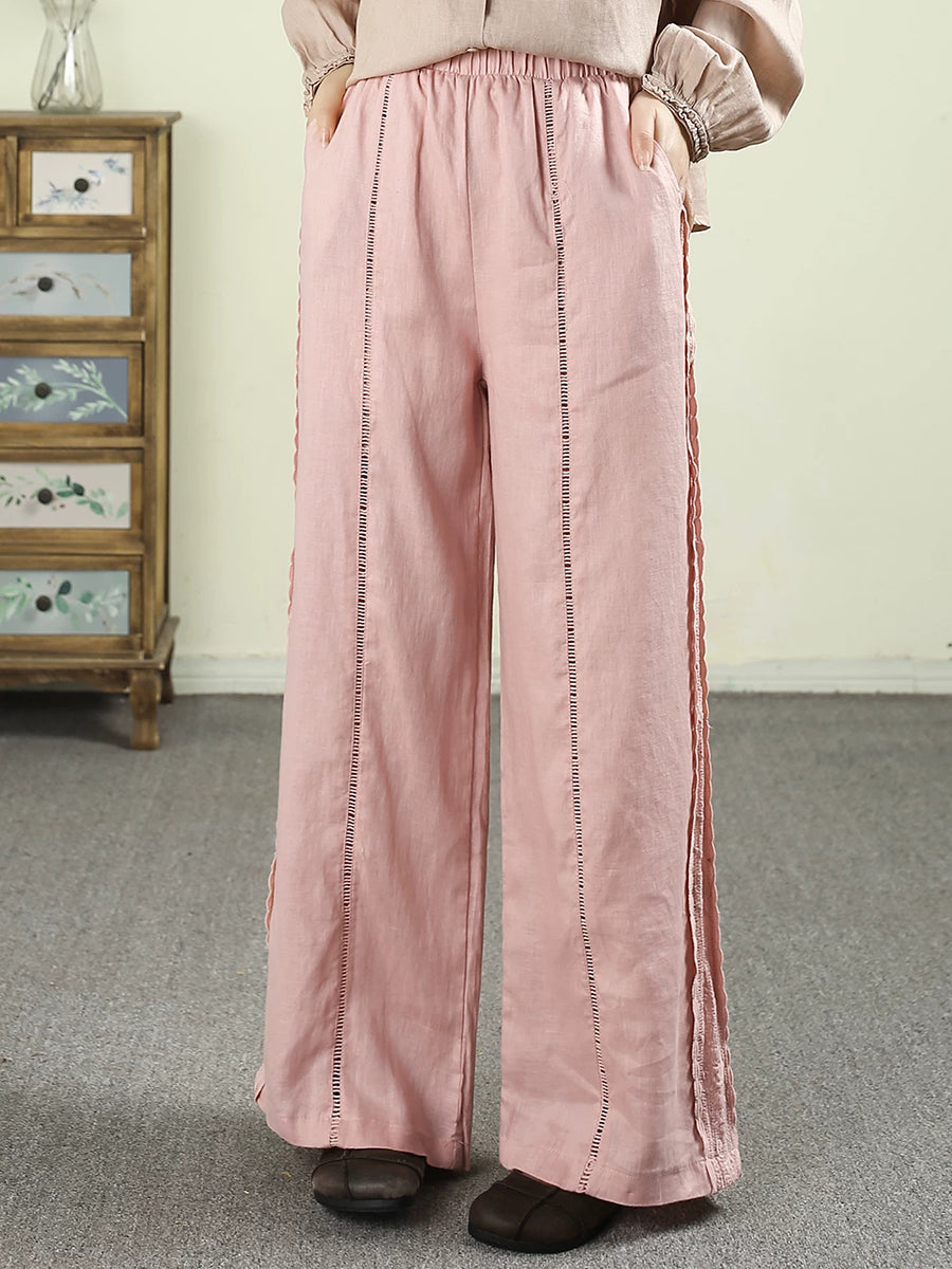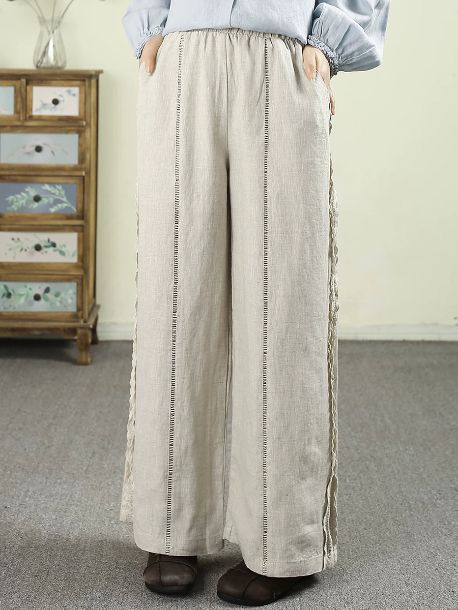 Women Spring Pure Color Lace 100%Linen Straight Pants