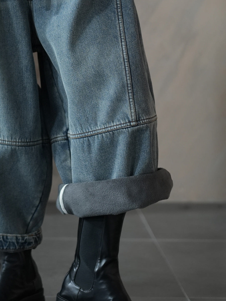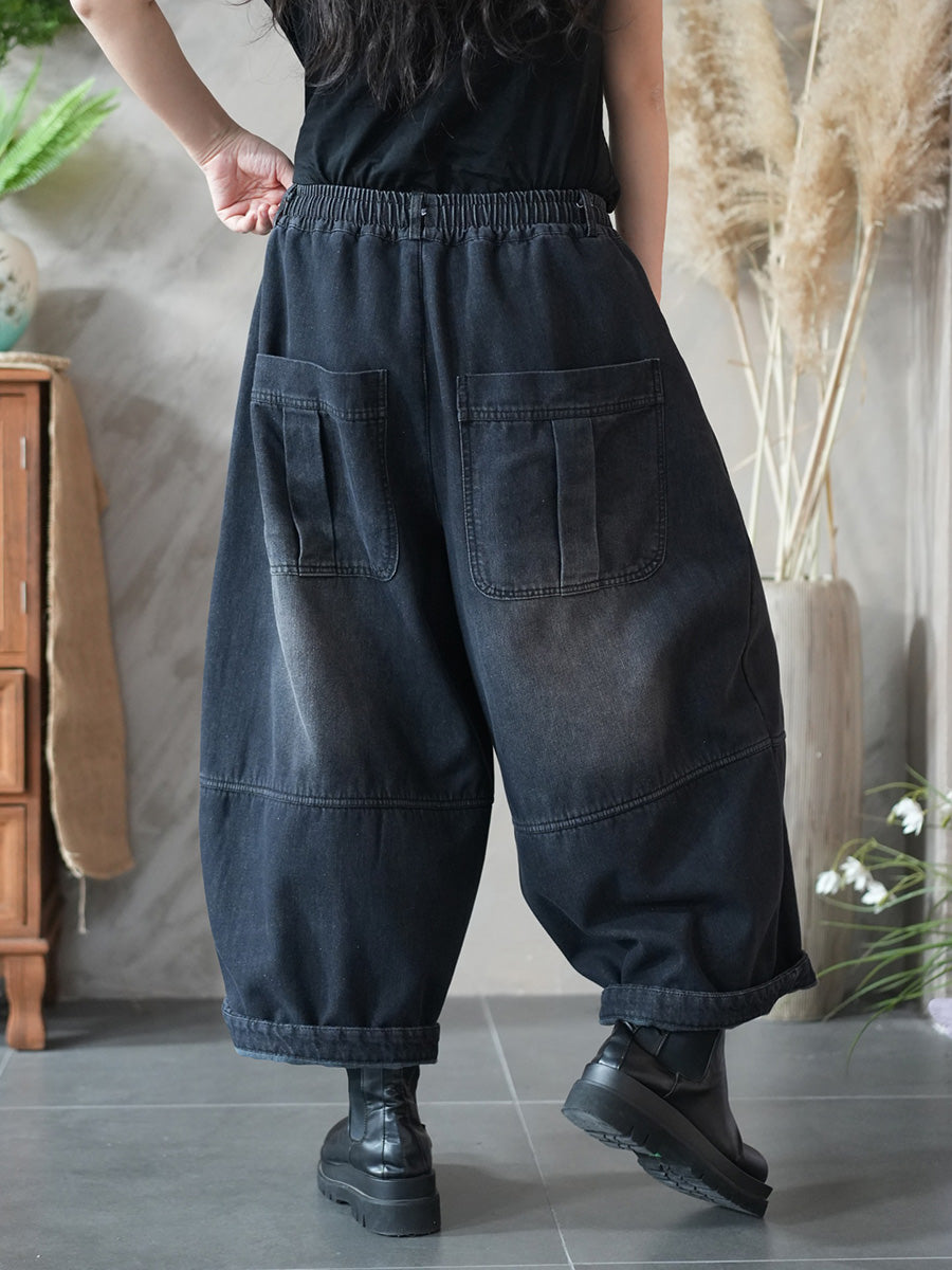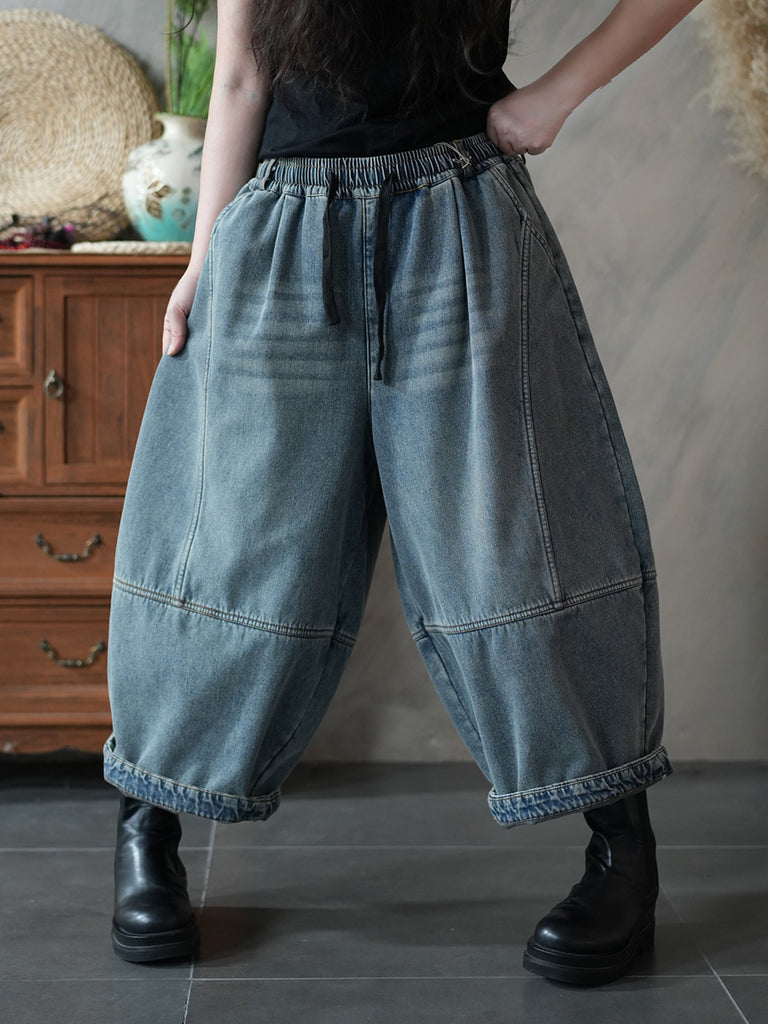 Women Winter Retro Pure Color Fleece-lined Denim Harem Pants