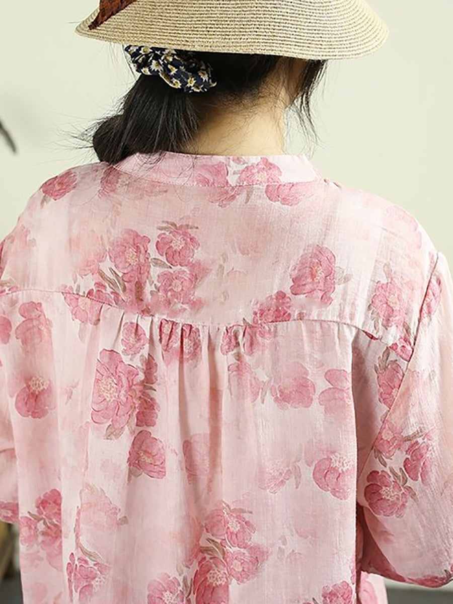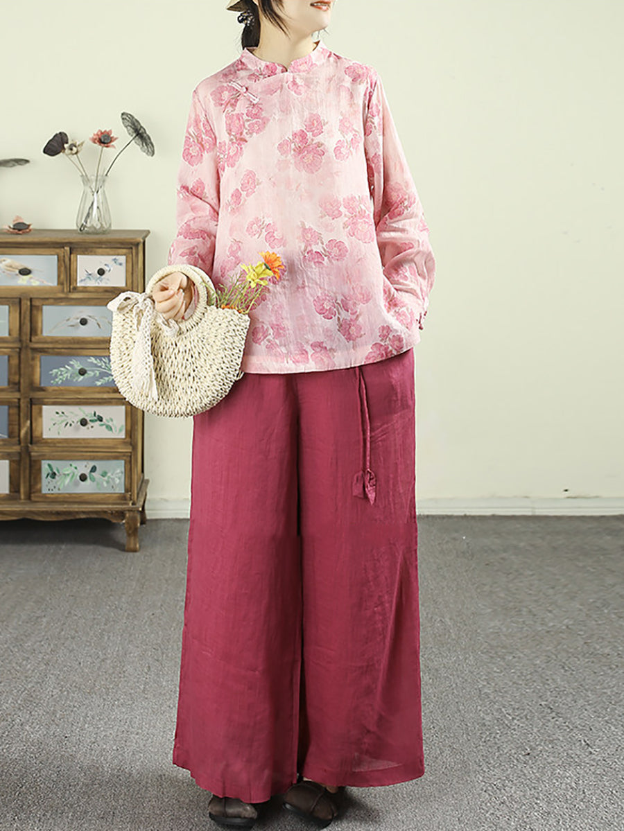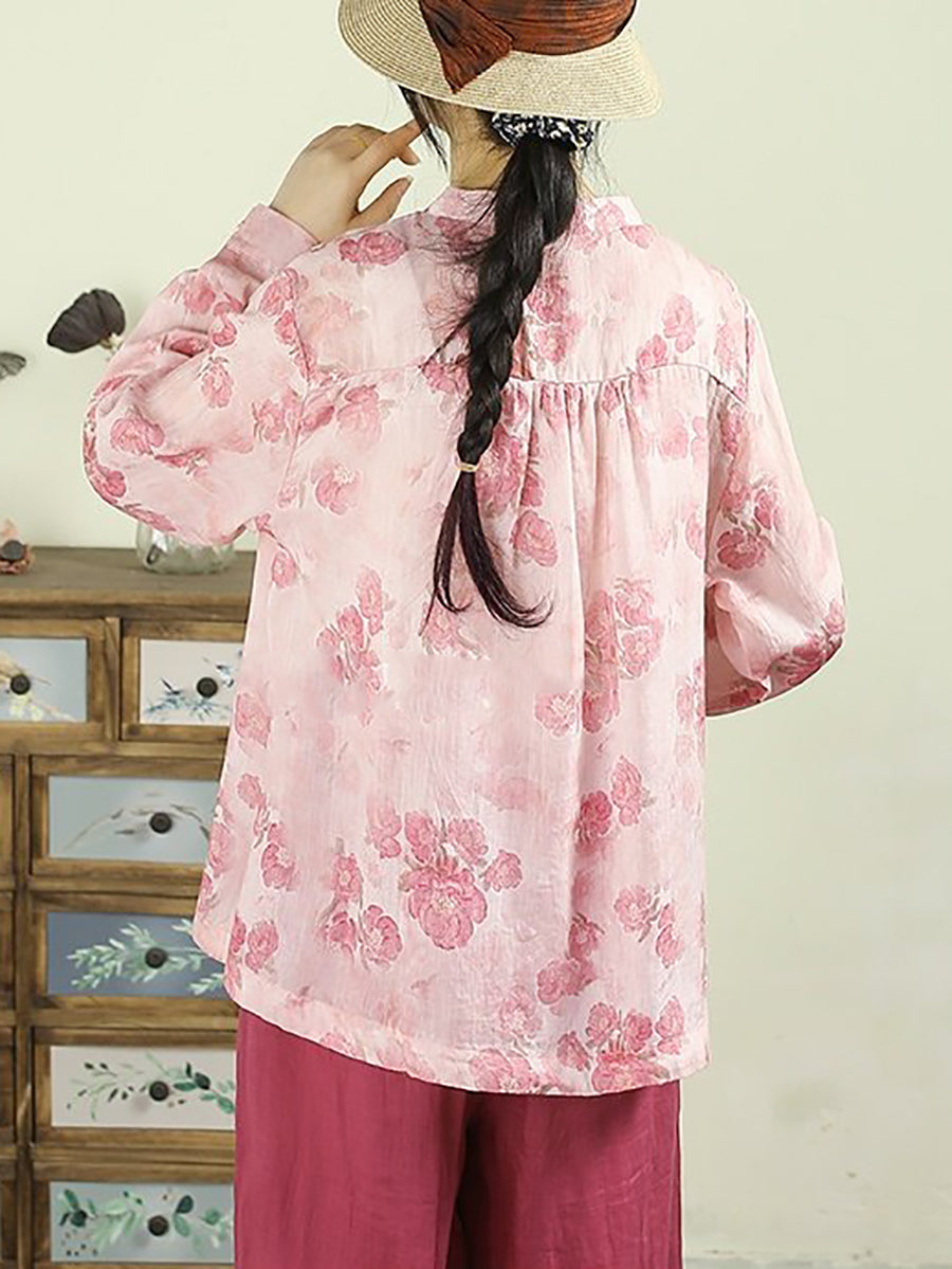 Women Ethnic Spring Flower Stand Collar 100%Ramie Blouse
