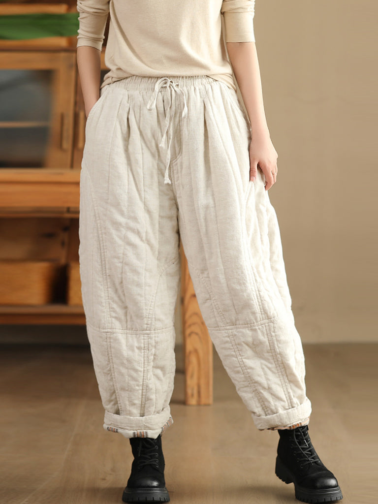 Women Autumn Pure Color 100%Linen Padded Harem Pants