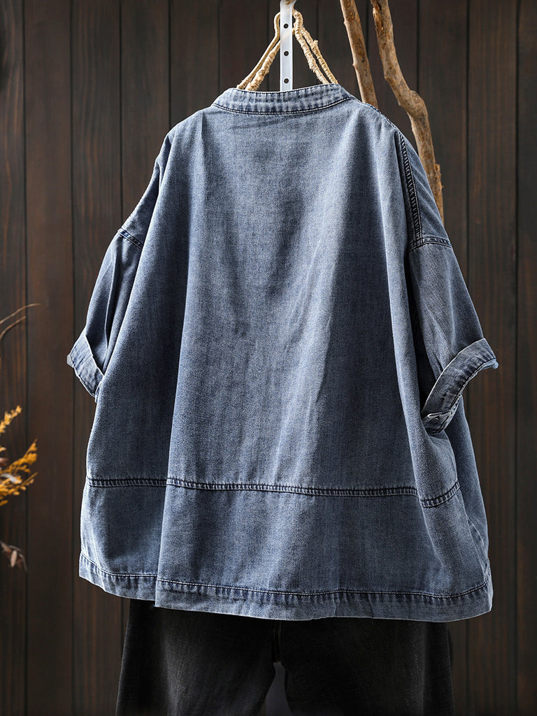 Plus Size Women Summer Retro Pure Color Stand Collar Denim Shirt