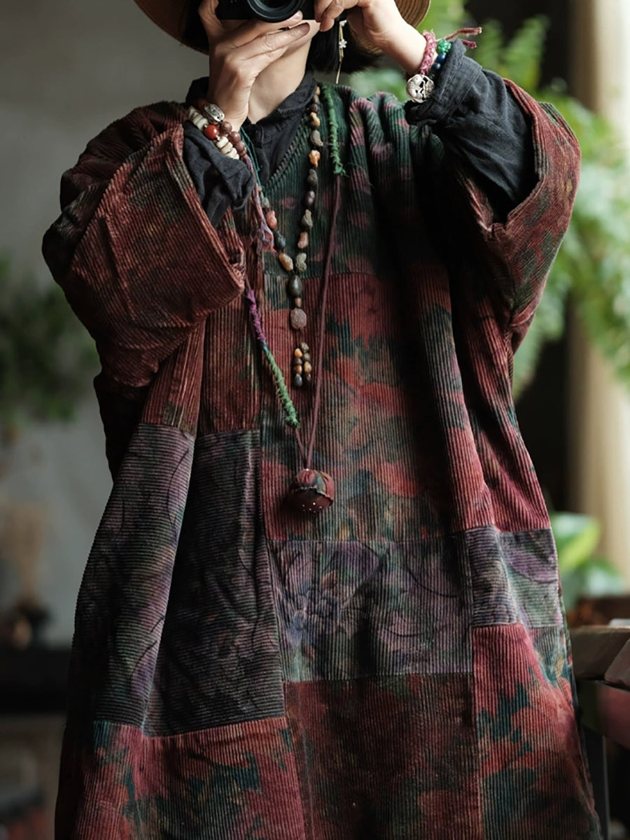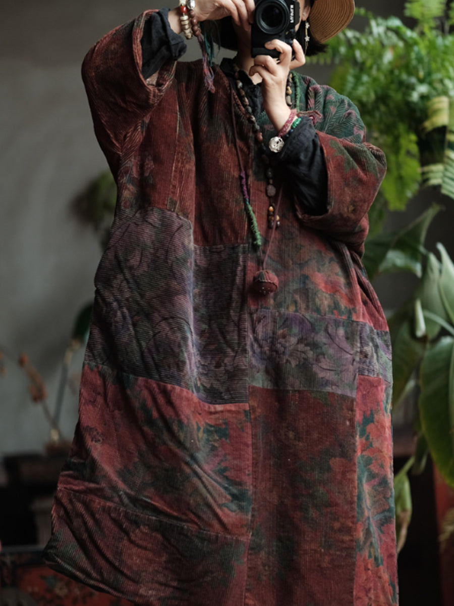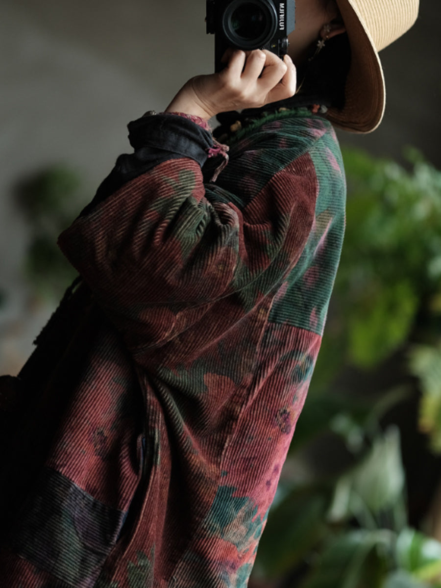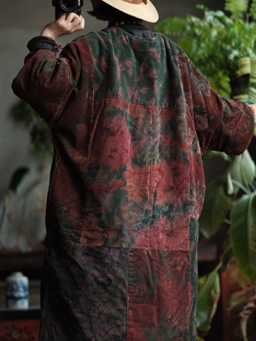 Women Vintage Winter Flower Cotton V-Neck Padded Coat