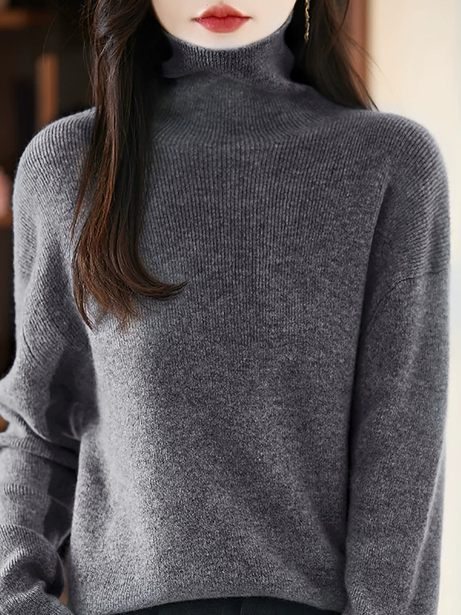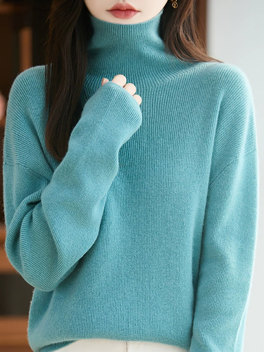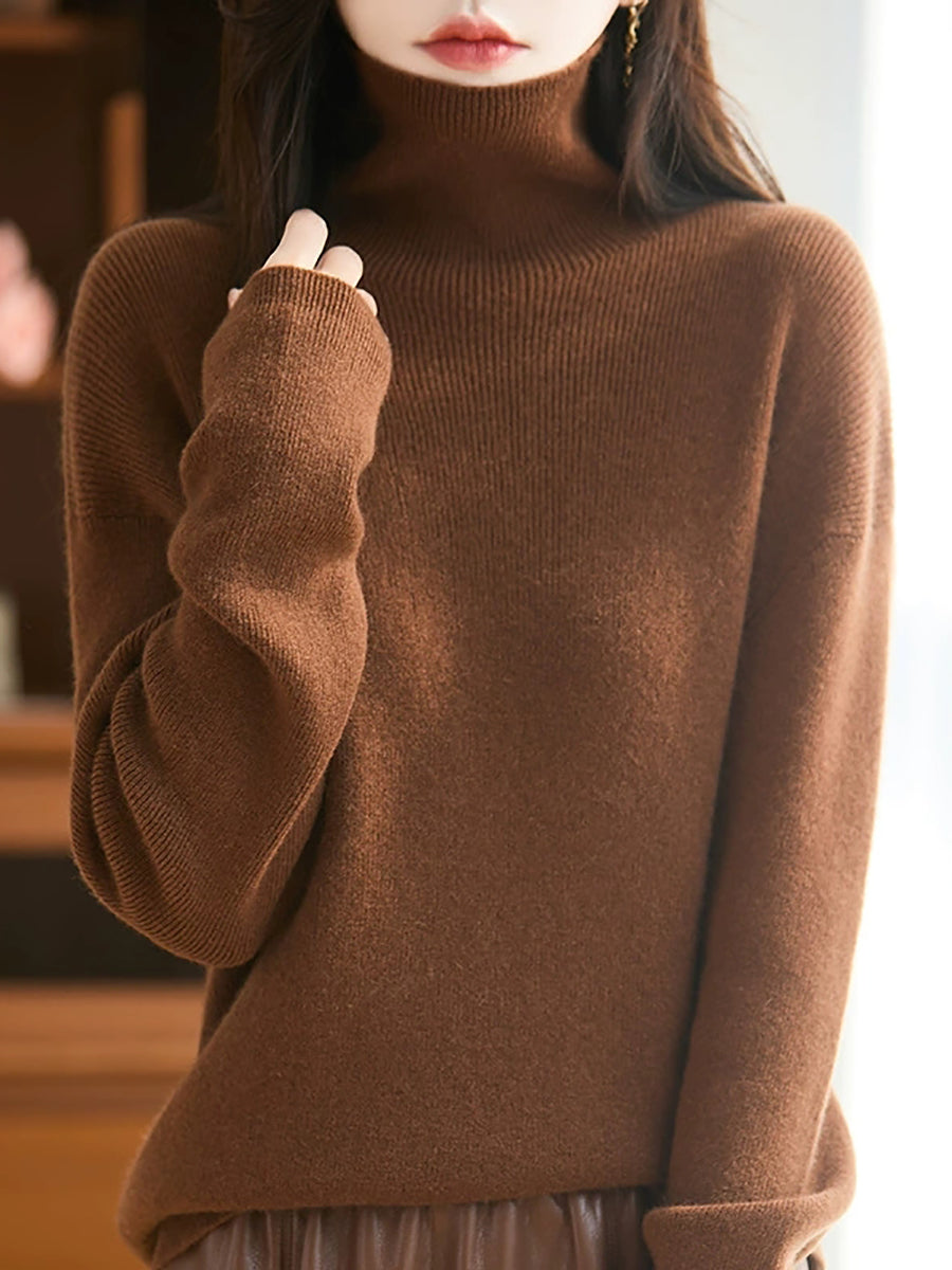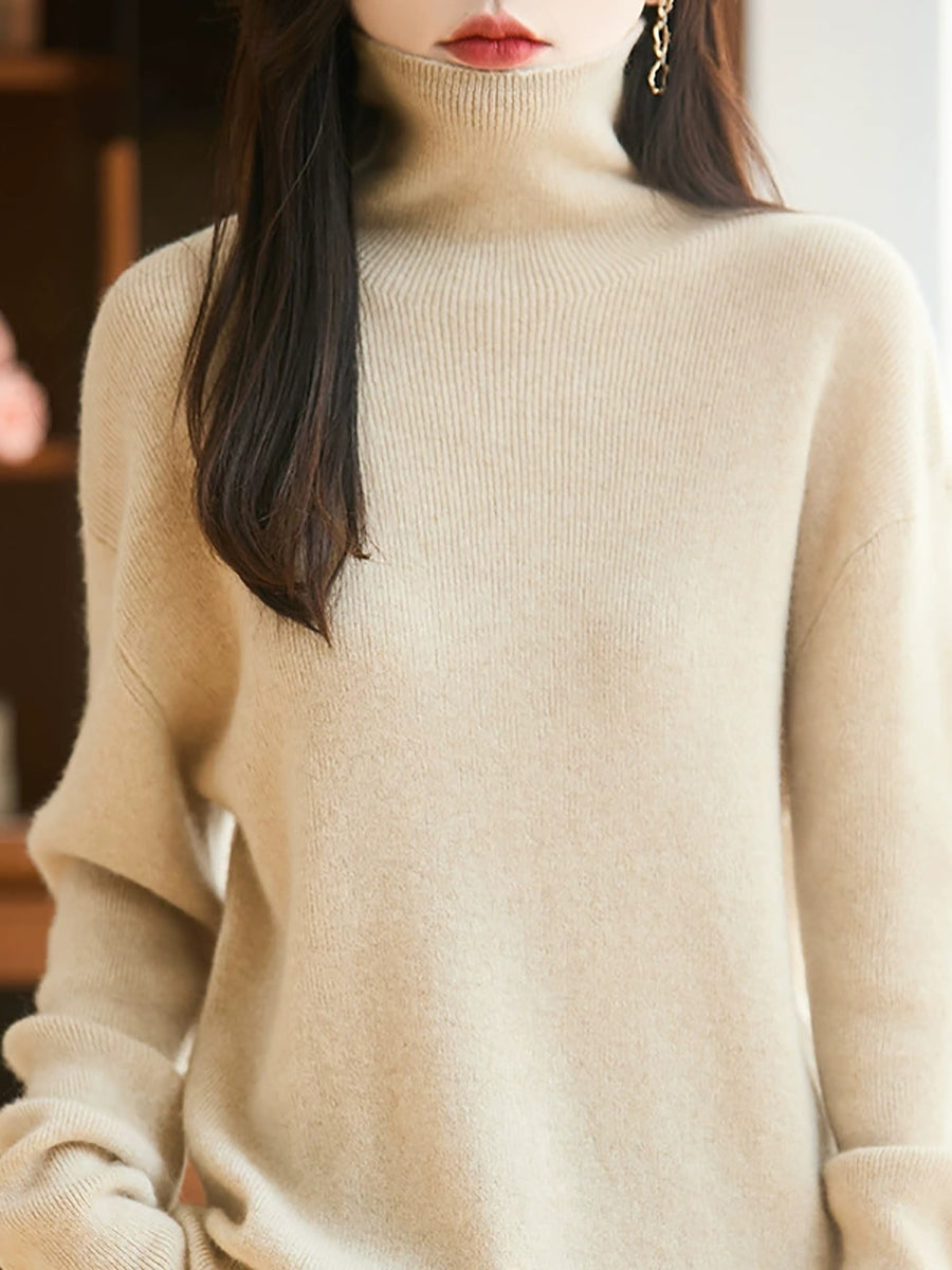 Women Autumn Artsy Pure Color Wool Turtleneck Sweater
