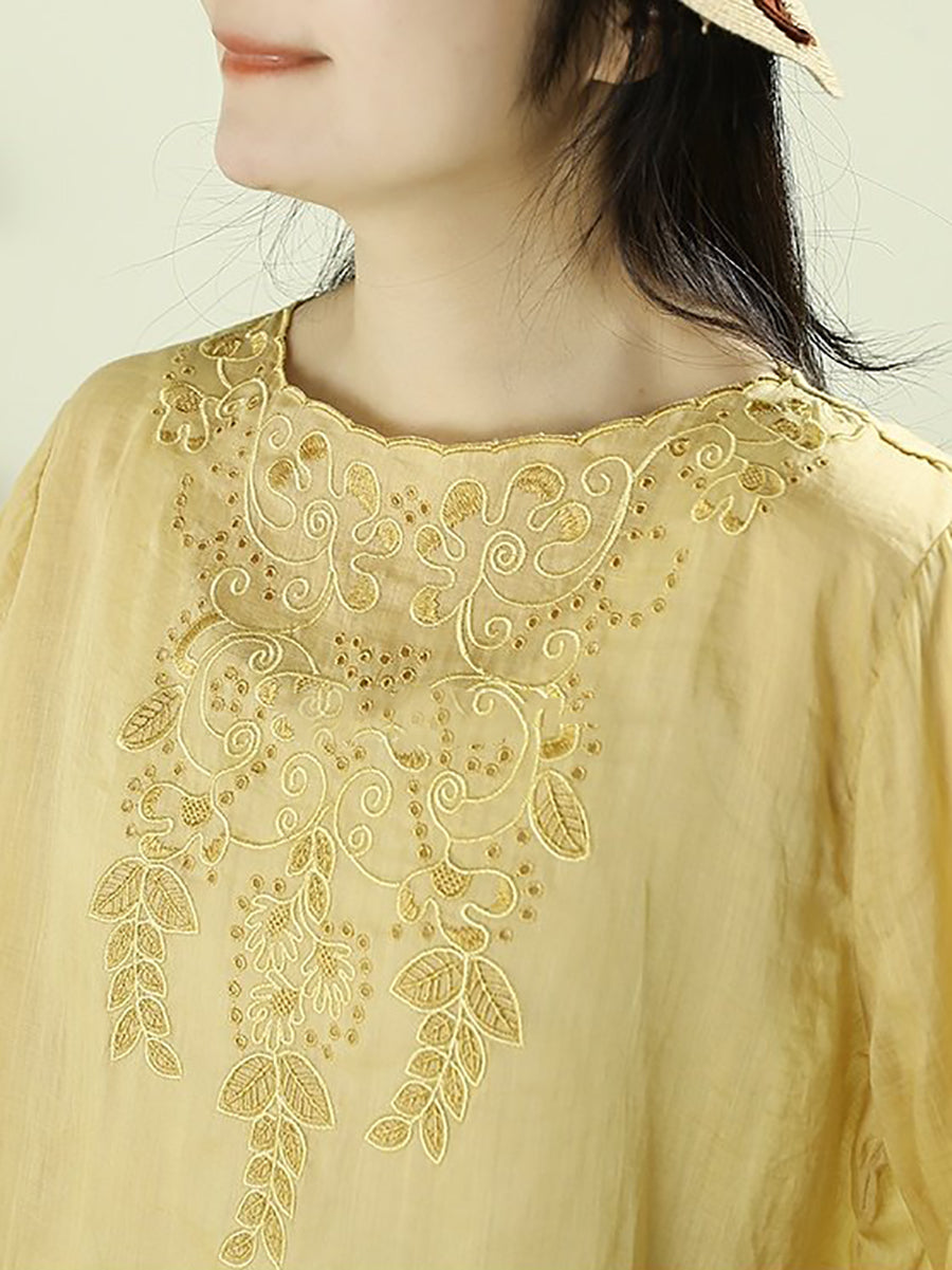 Women Artsy Spring Embroidery O-Neck 100%Ramie Blouse