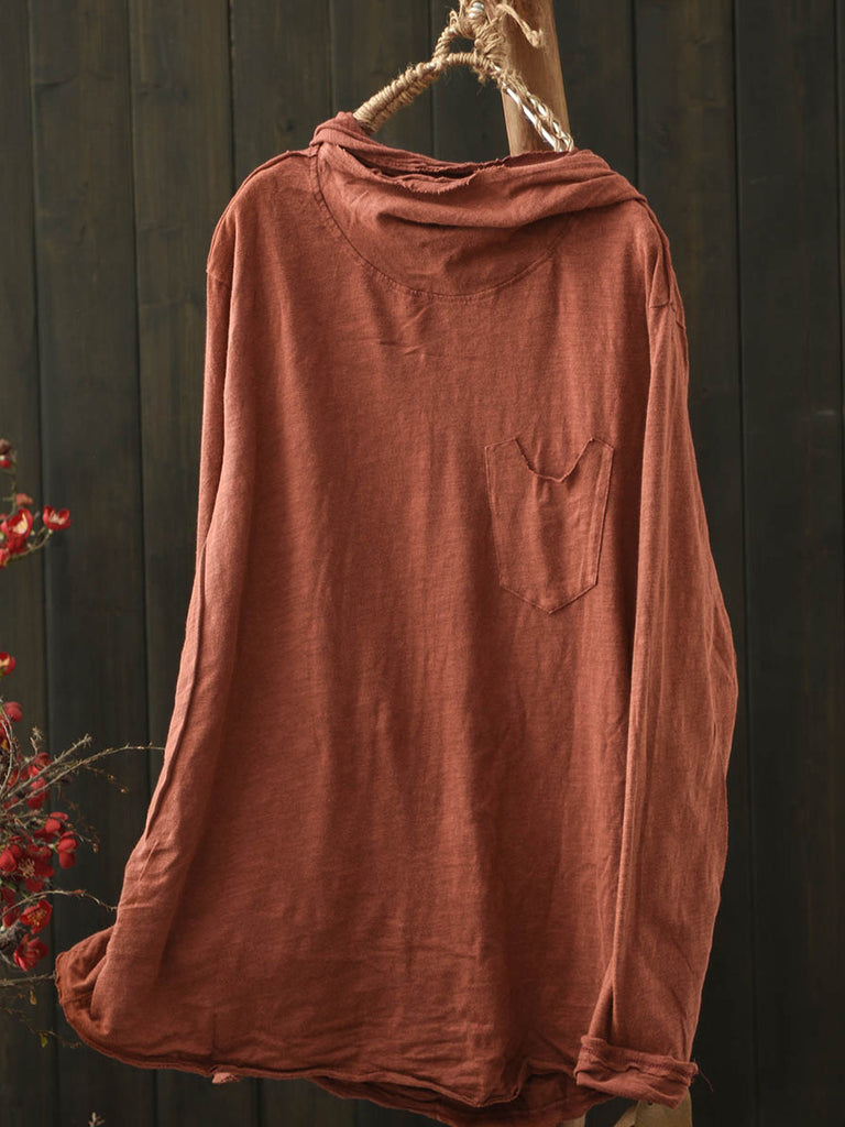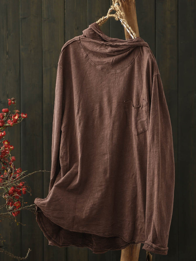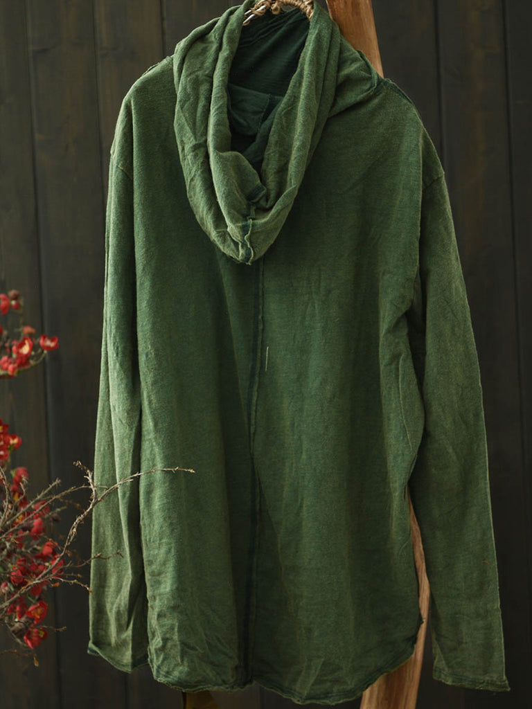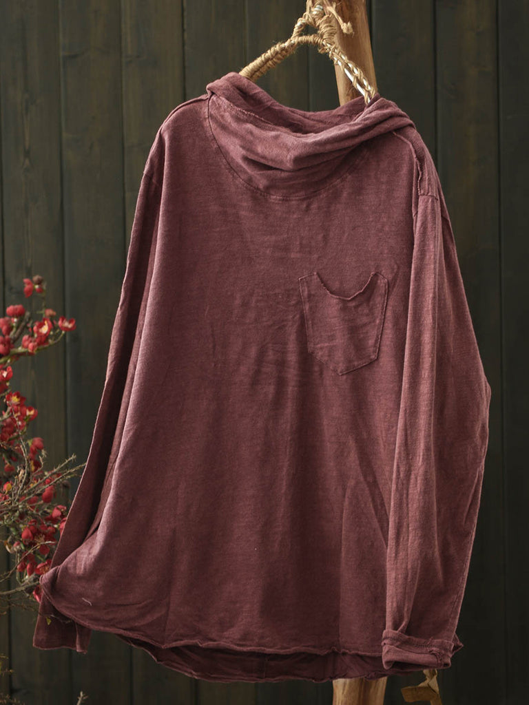 Women Winter Retro Pure Color Cotton Hooded Blouse