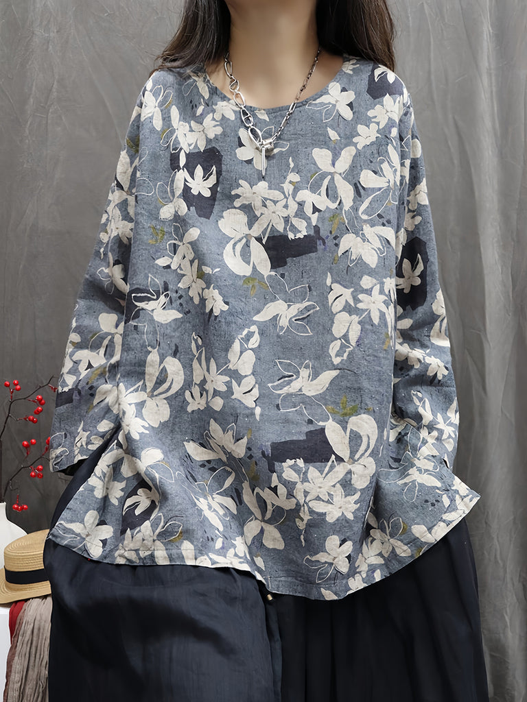 Women Autumn Vintage Flower 100%Linen O-Neck Shirt