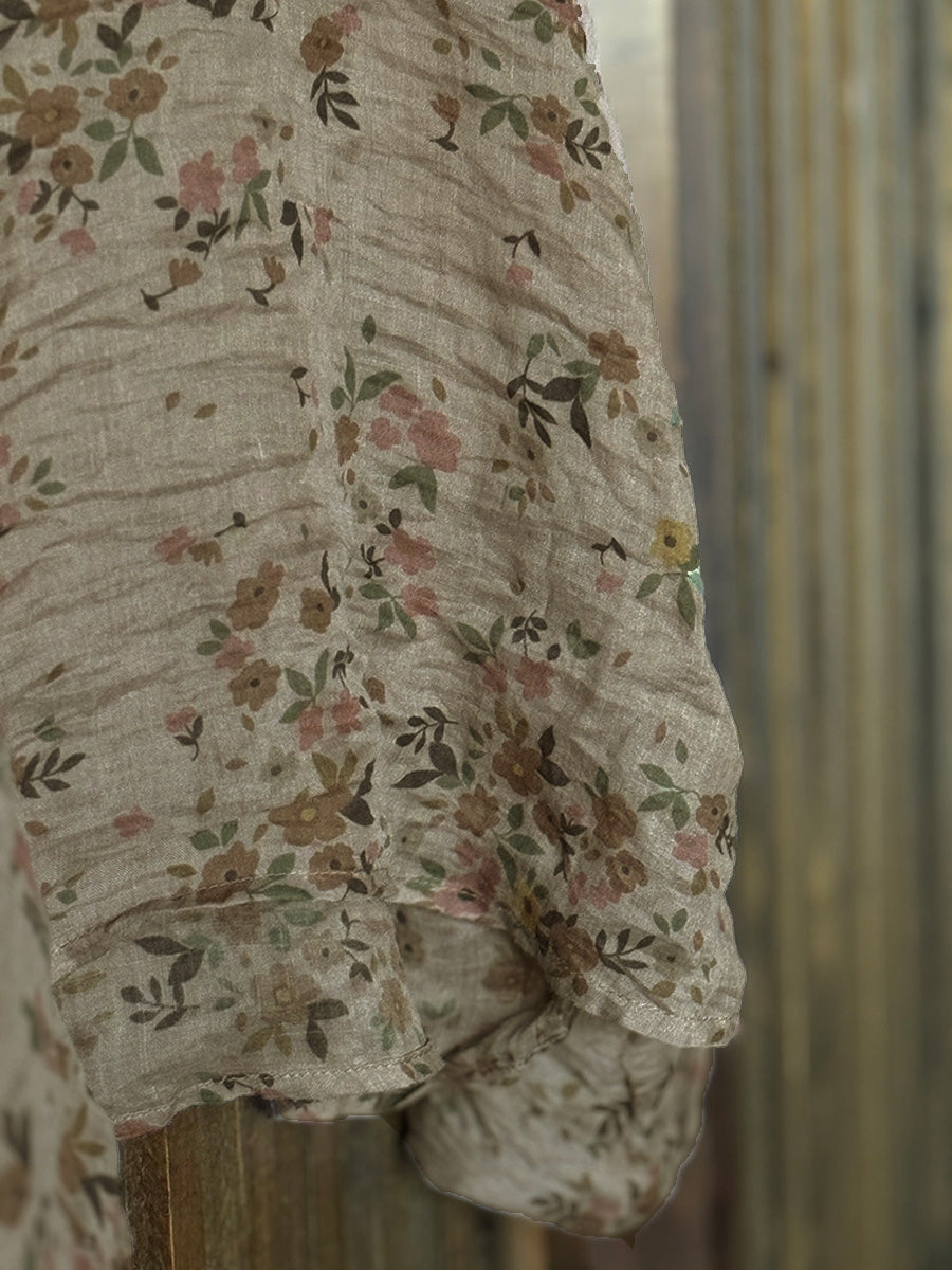 This blouse features a stylish turtleneck collar, full sleeves with raglan style and a retro-inspired autumn flower pattern. Perfect for wearing in the spring and fall seasons. Made of high-quality Ramie material.