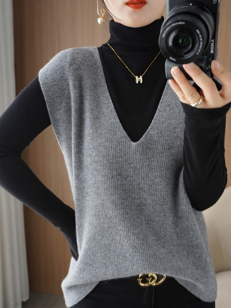 Women Autumn Casual Pure Color V-Neck Knitted Vest