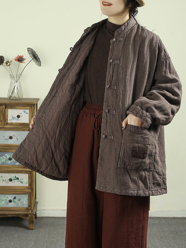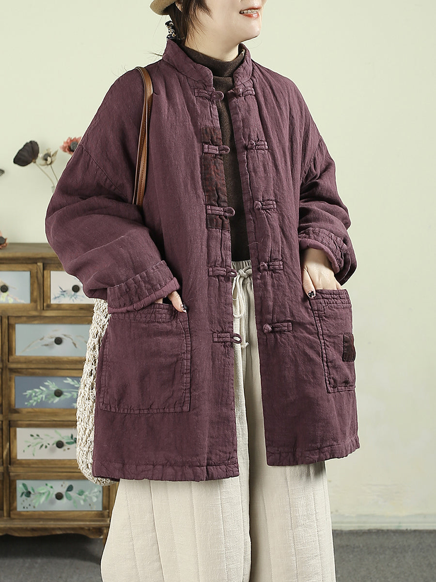 Women Winter Ethnic Patchwork 100%Linen Stand Collar Coat