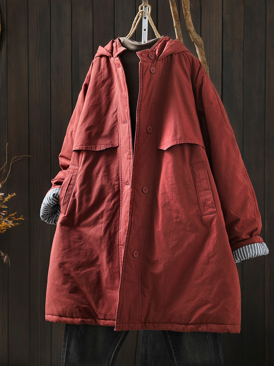 Women Winter Retro Pure Color Hooded Padded Coat