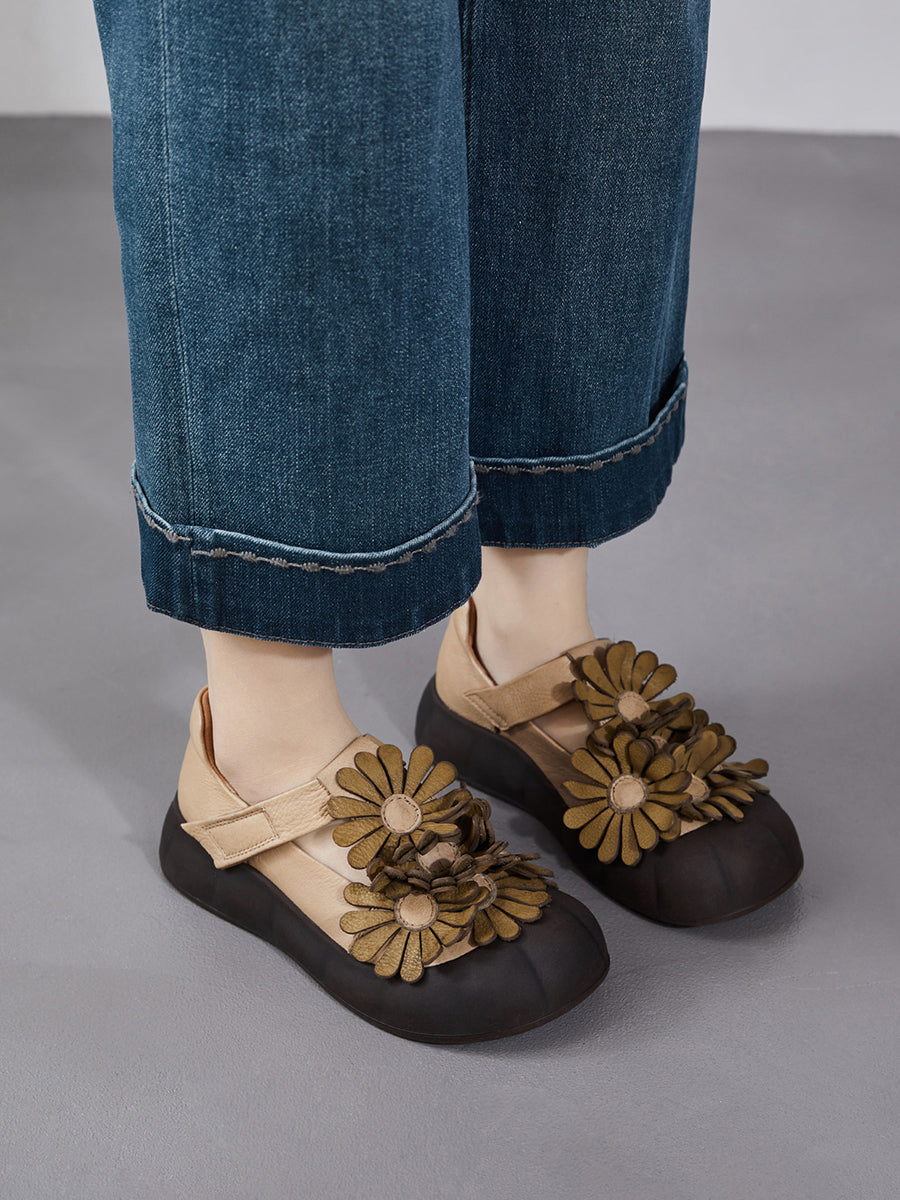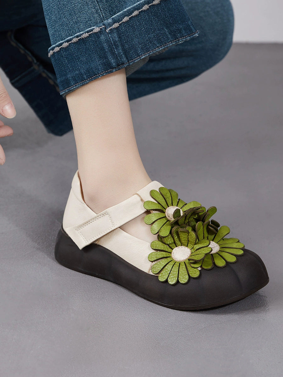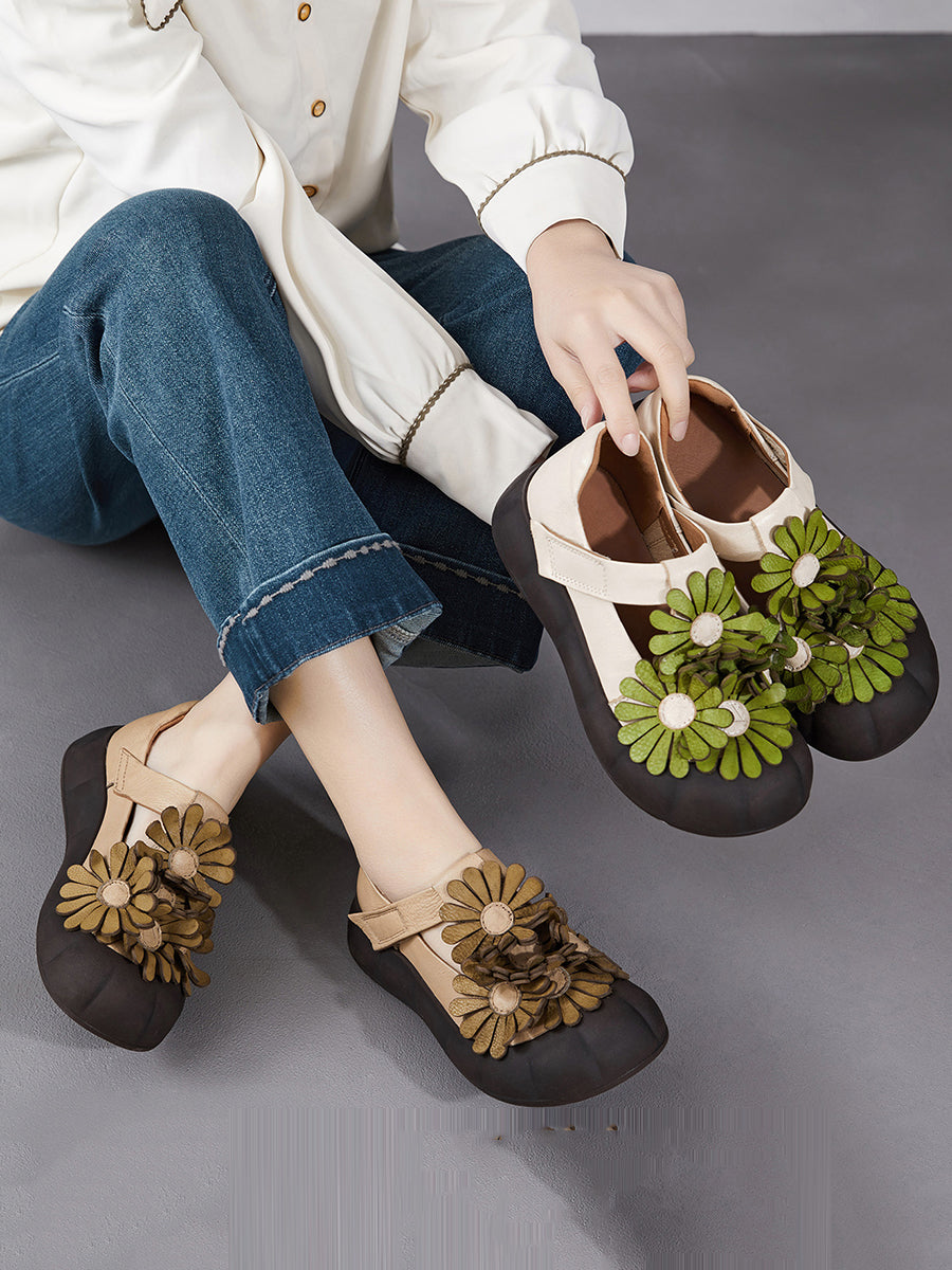 Women Summer Retro Genuine Leather Flower Shoes
