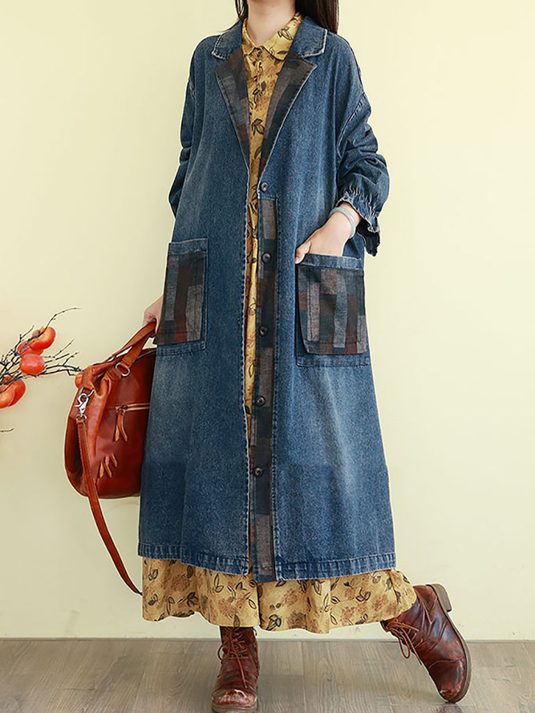 Women Autumn Spliced Turn-down Collar Denim Coat