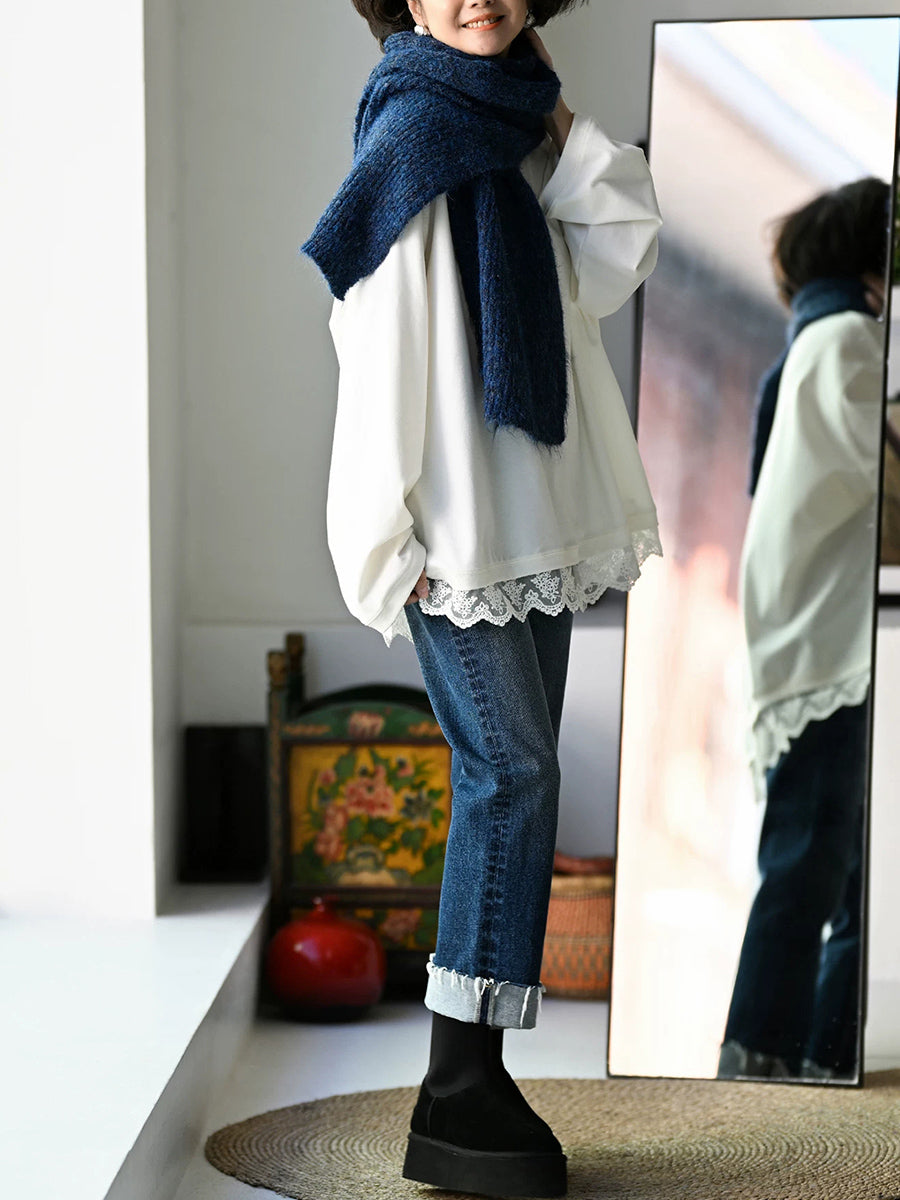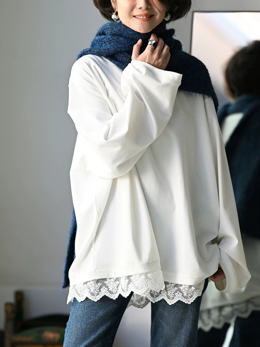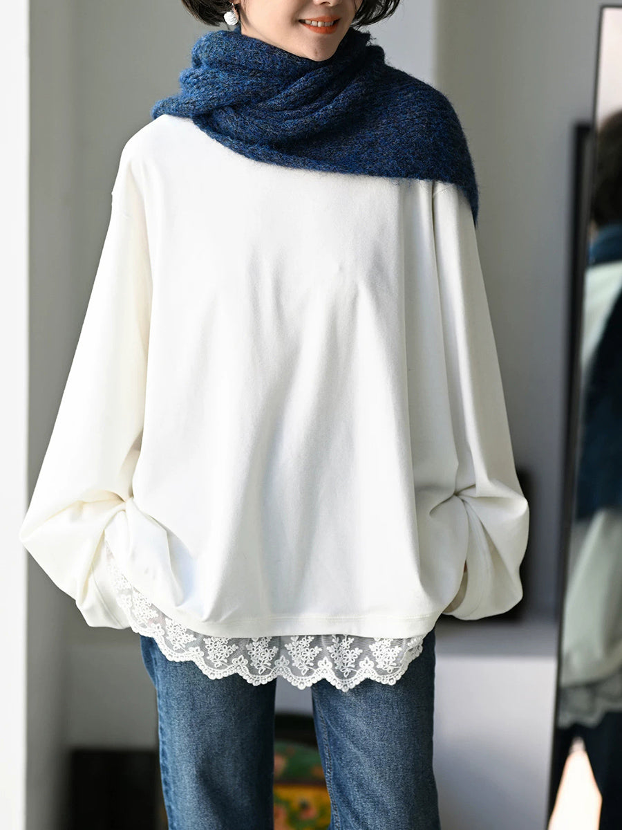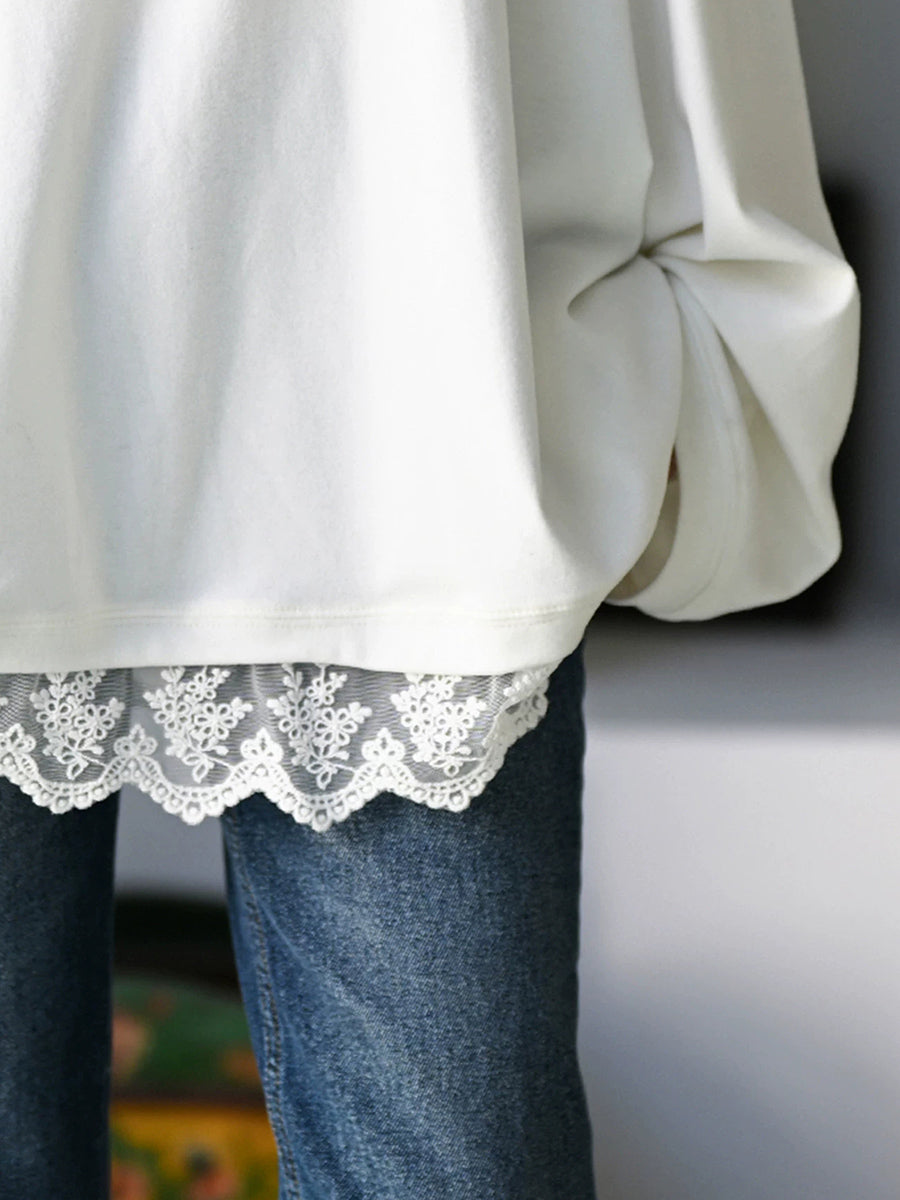 Women Artsy Spring Lace Hem O-Neck 100%Cotton Blouse
