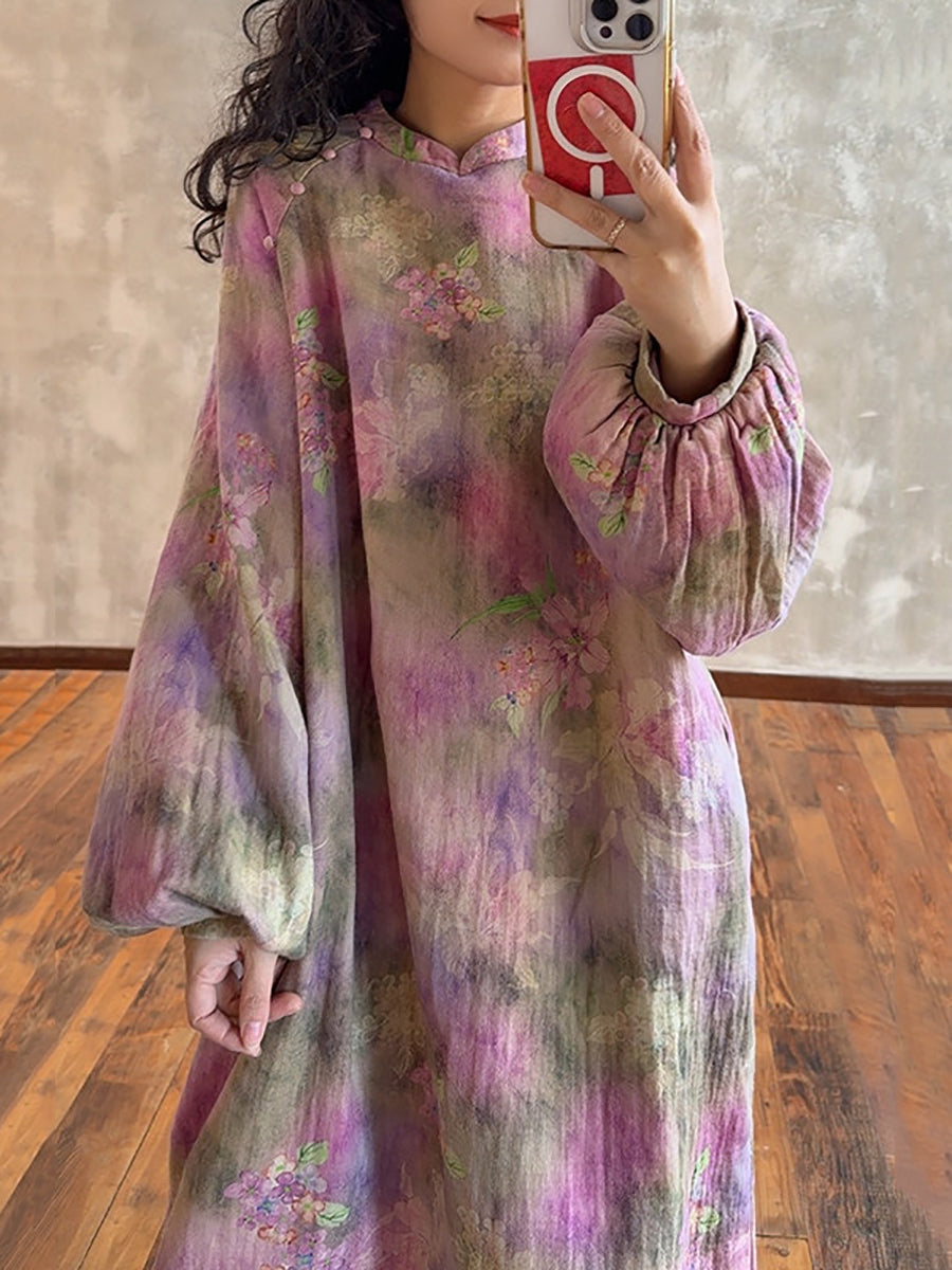 Women Autumn Tie-dye Stand Collar 100%Cotton Loose Dress
