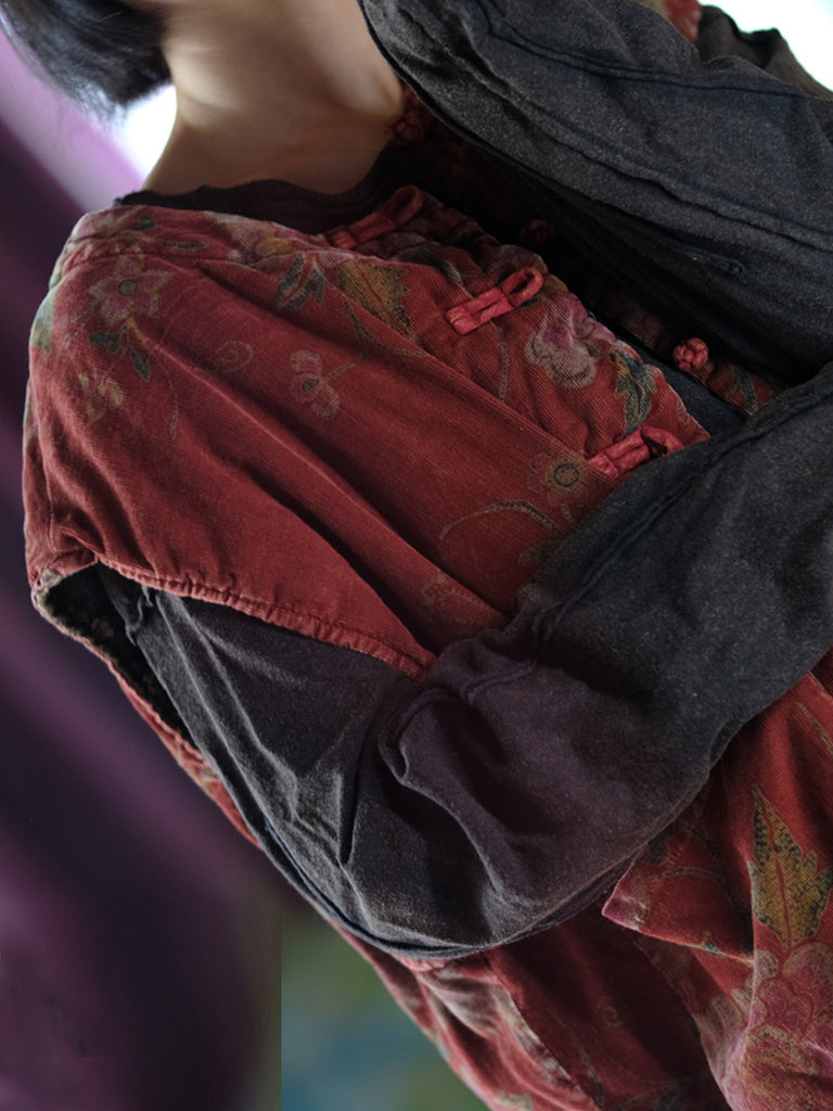 Women Autumn Retro Flower O-Neck Cotton Padded Vest
