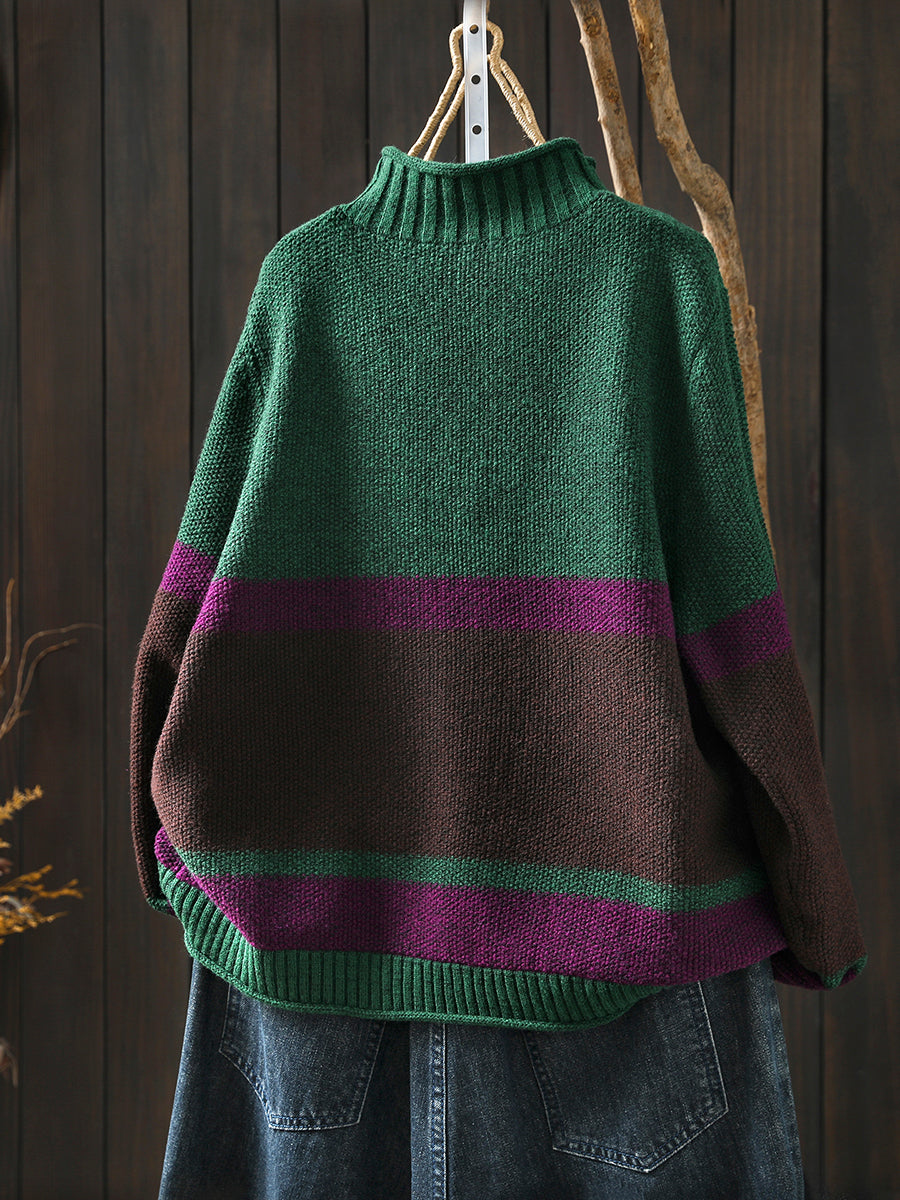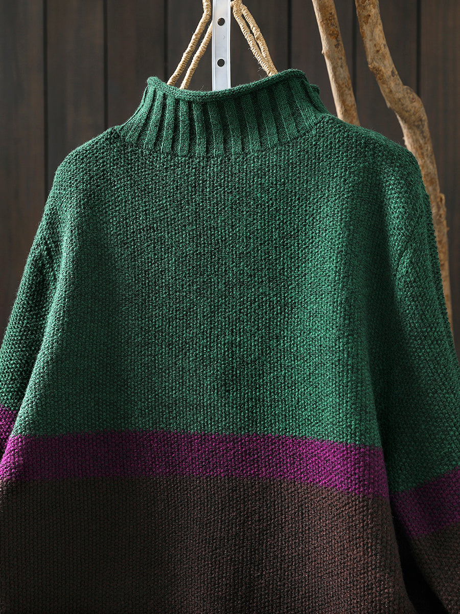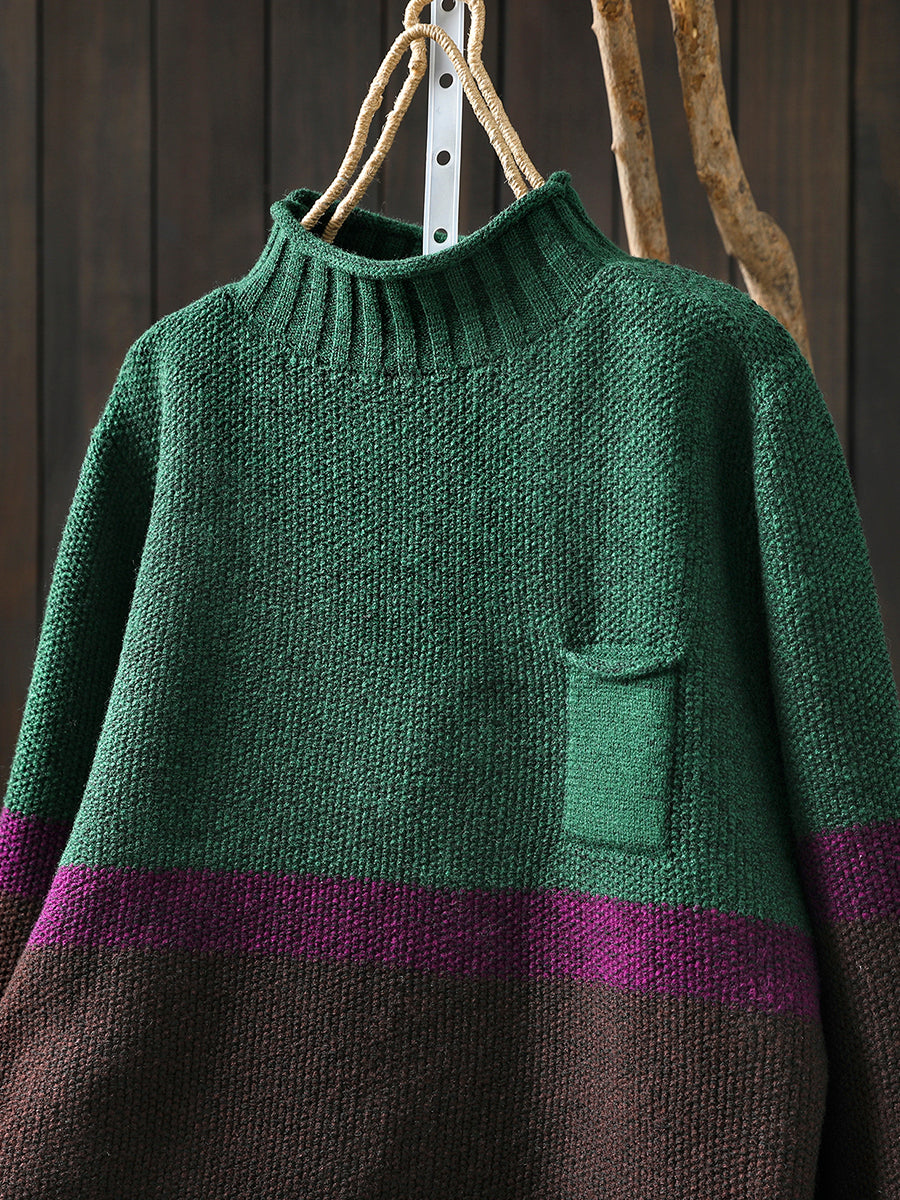 Women Autumn Artsy Colorblock Knitted Half-Turtleneck Sweater