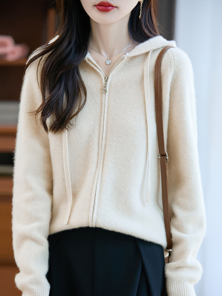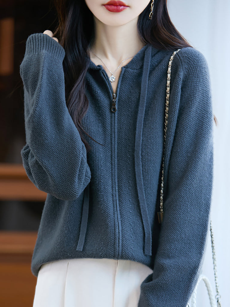 Women Autumn Pure Color Wool Hooded Cardigan Sweater
