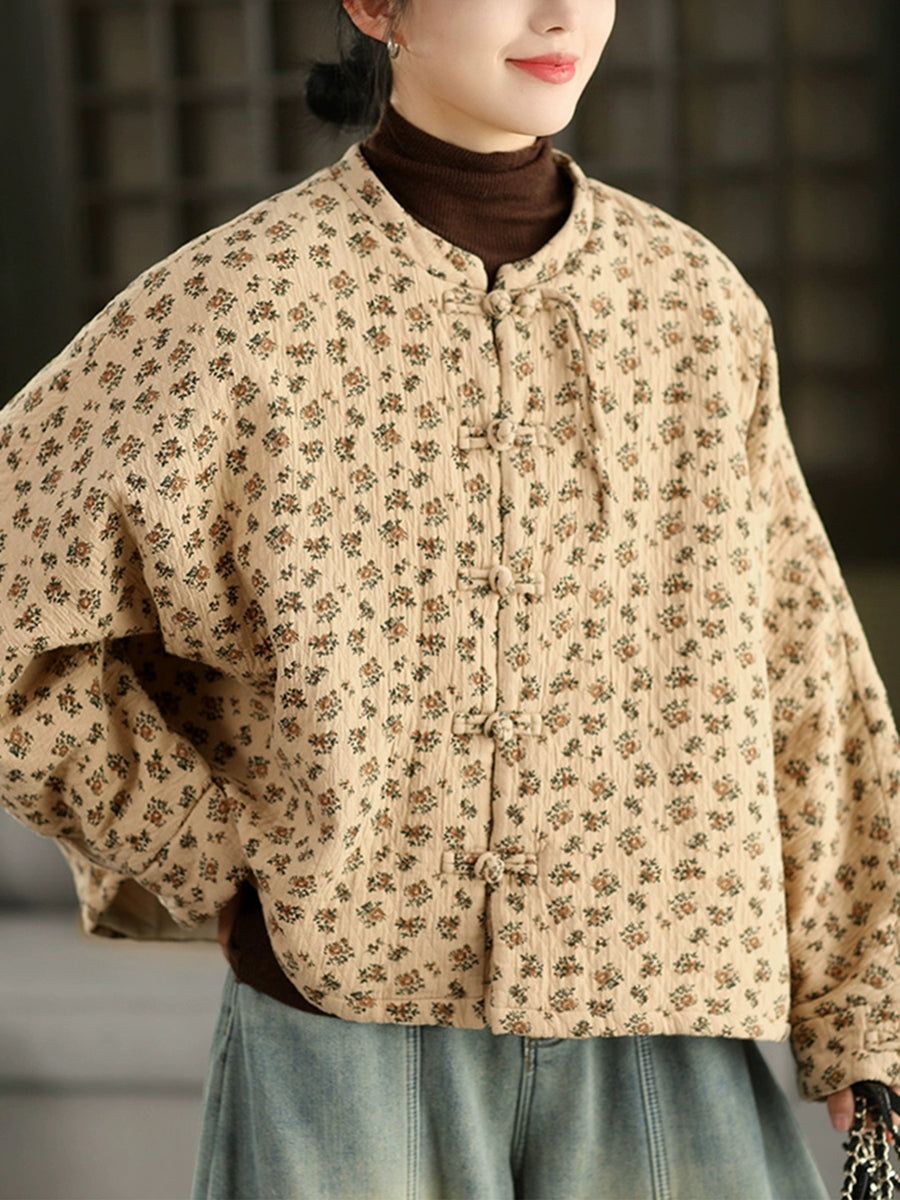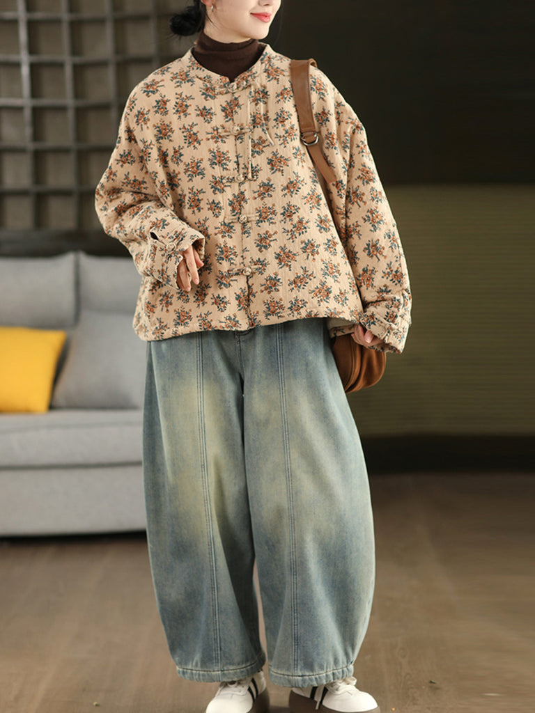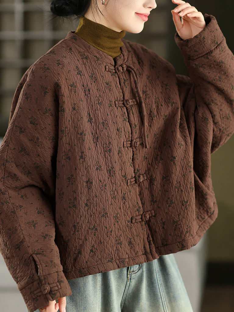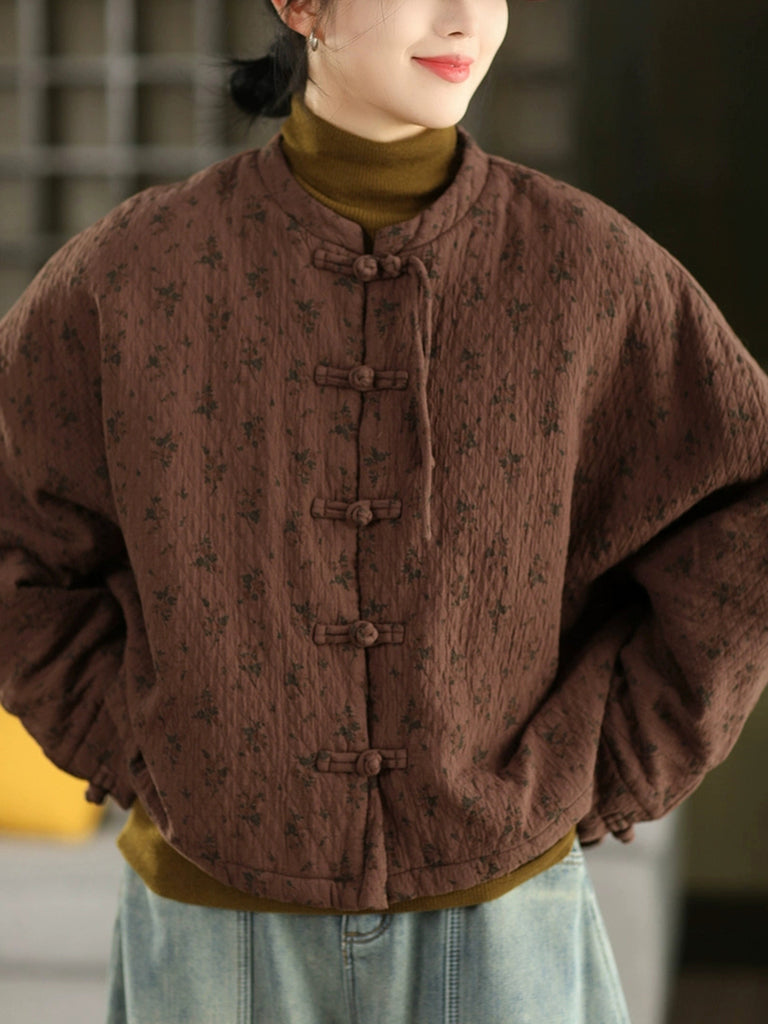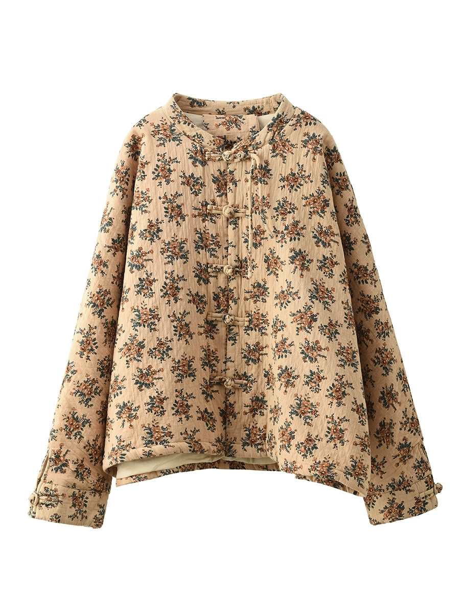 Women Winter Ethnic Floral Stand Collar Padded Coat