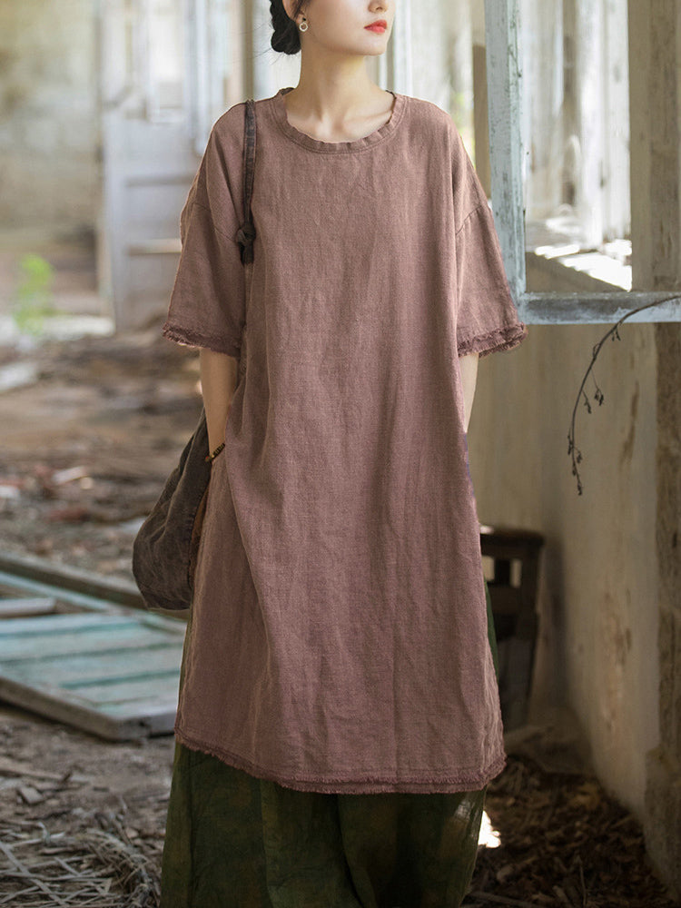 This dress is designed to keep you cool during summer while maintaining a fashionable look, with its knee-length design, solid pattern, O-Neck collar, and split hem detail.