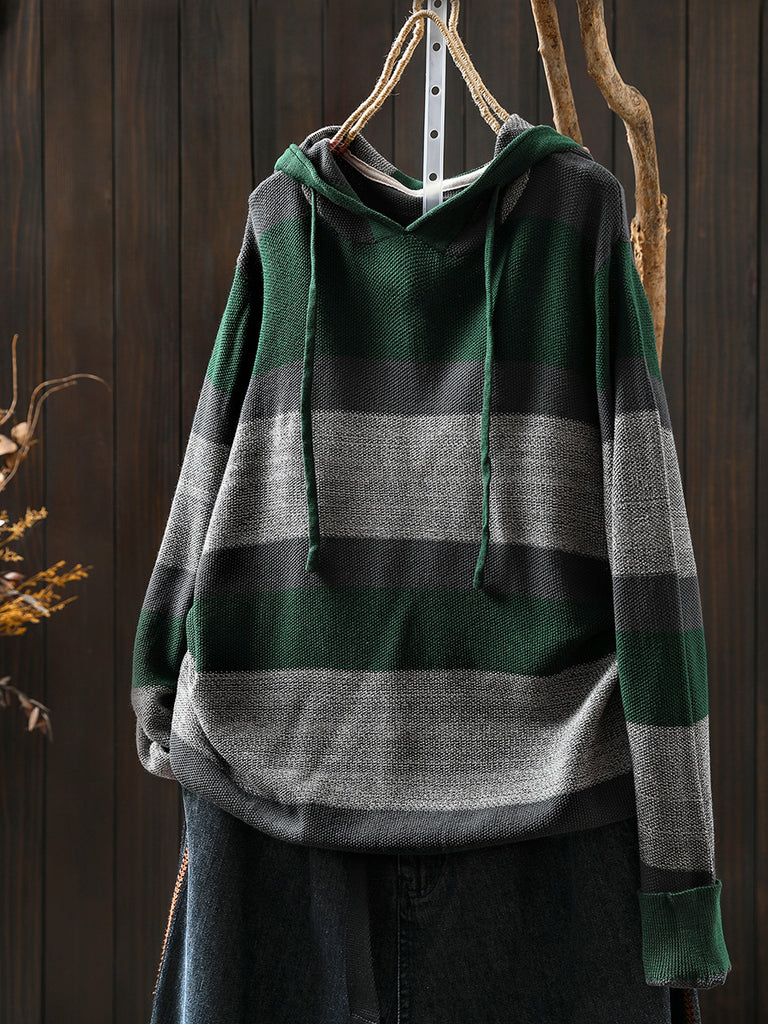 Women Autumn Casual Colorblock Stripe Knitted Hoodie