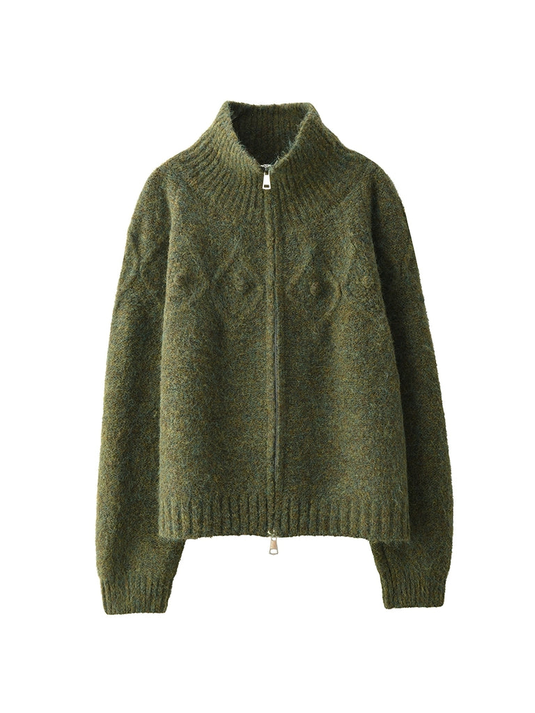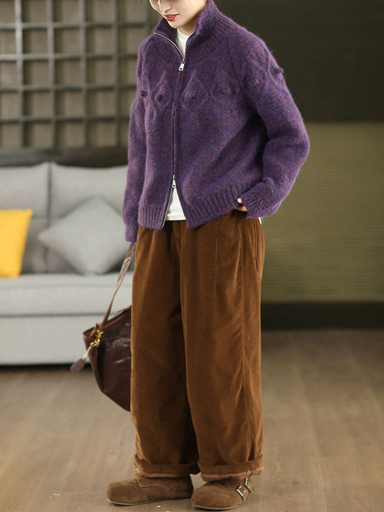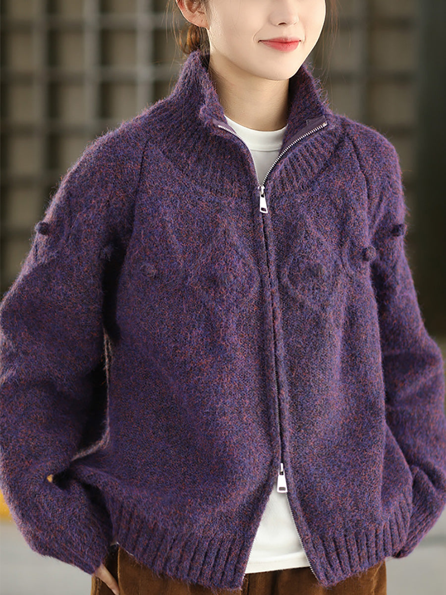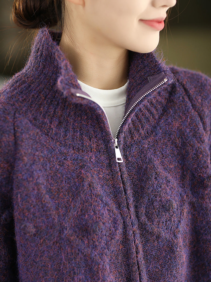 Women Autumn Retro Pure Color Stand Collar Sweater Coat
