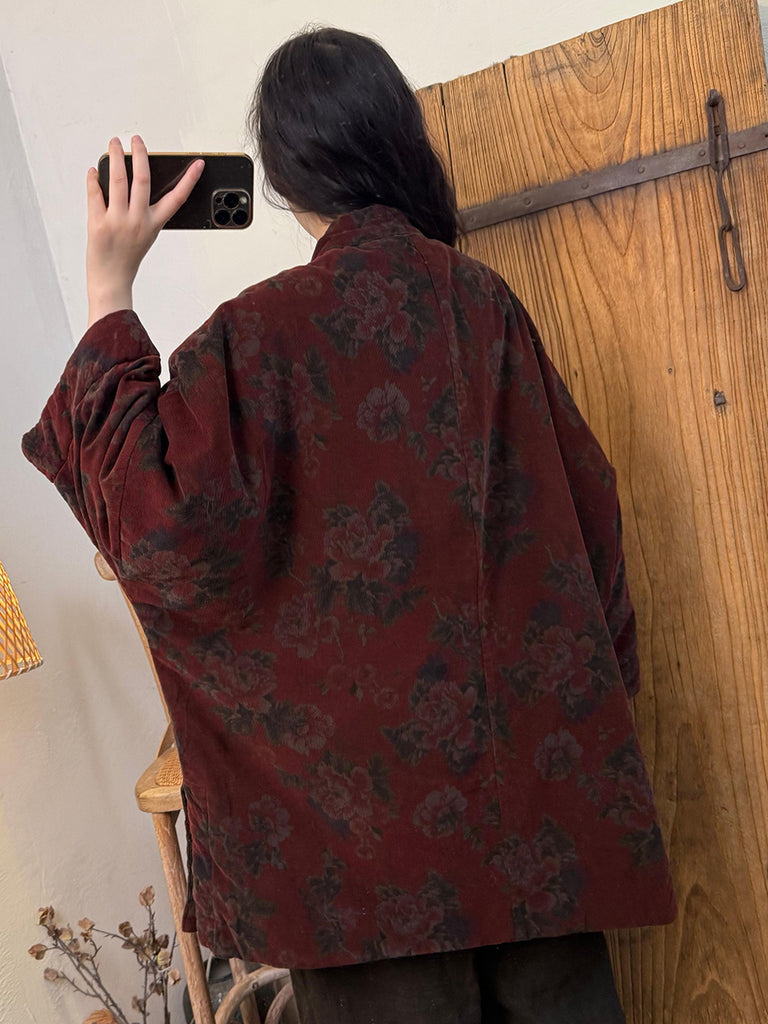 Women Ethnic Autumn Flower Stand Collar Corduroy Coat