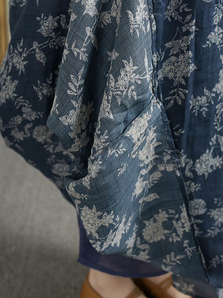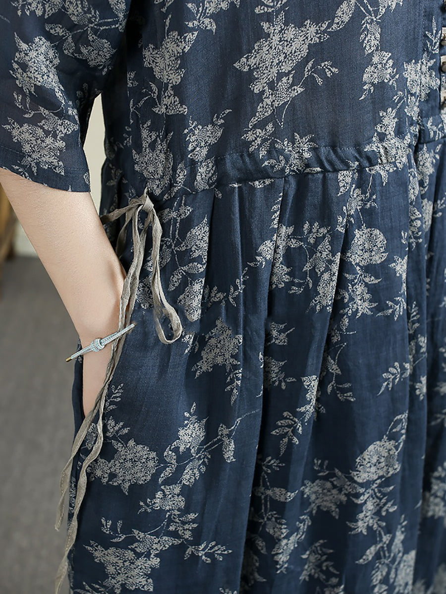 Plus Size Women Summer Vintage Flower V-Neck 100%Ramie Dress
