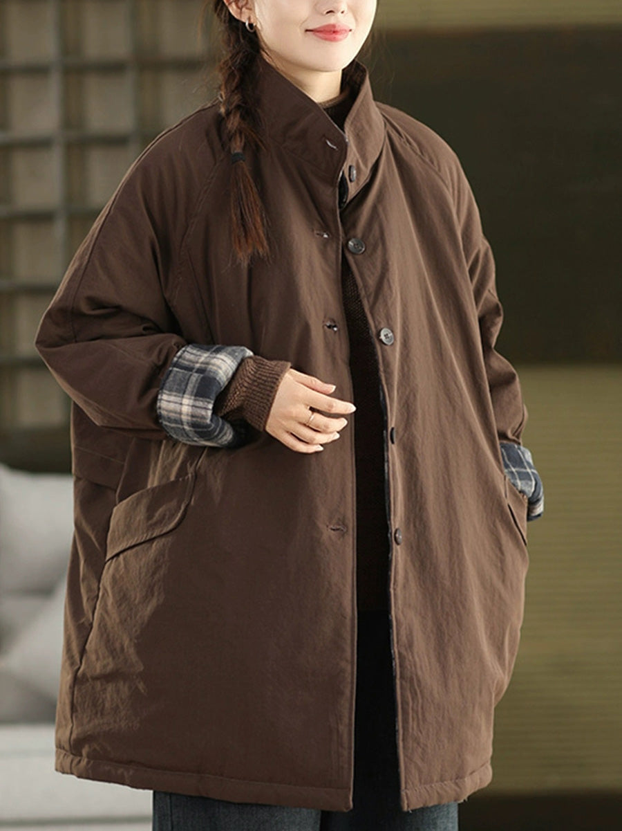 Crafted from cotton, this padded coat features a classic pure color design and a turn-down collar. Designed with full raglan sleeves offering a retro style, it is ideal for both
