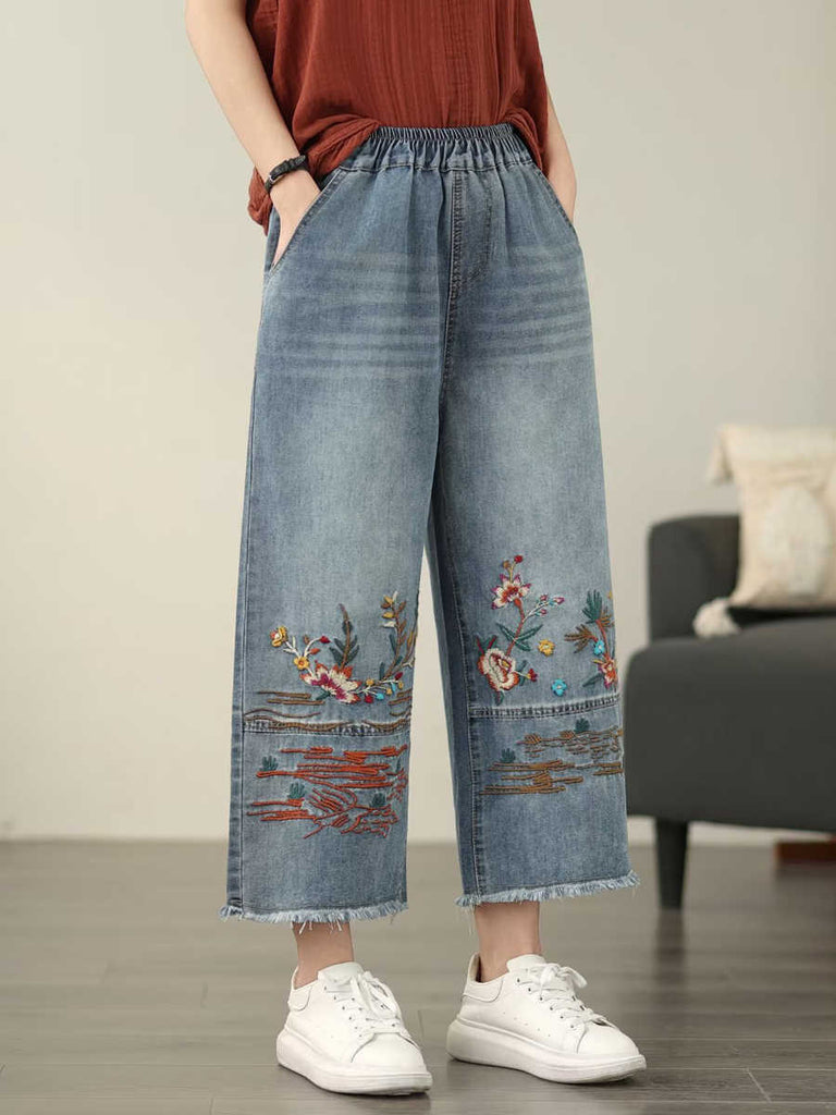Women Casual Summer Flower Embroidery Denim Straight Pants