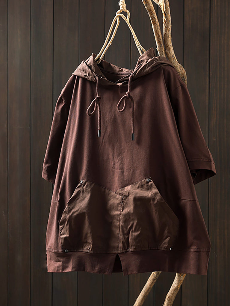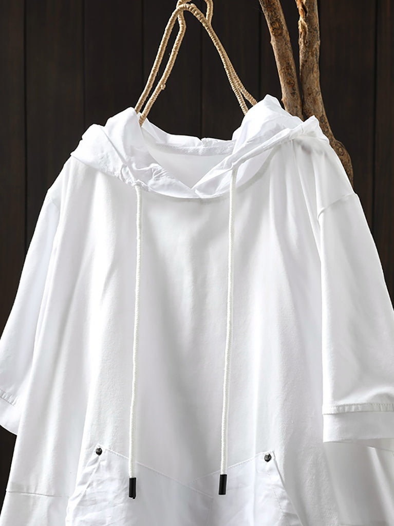 Women Summer Casual Pure Color O-Neck Cotton Hooded Shirt
