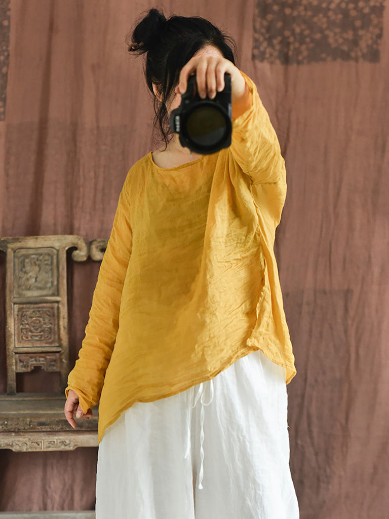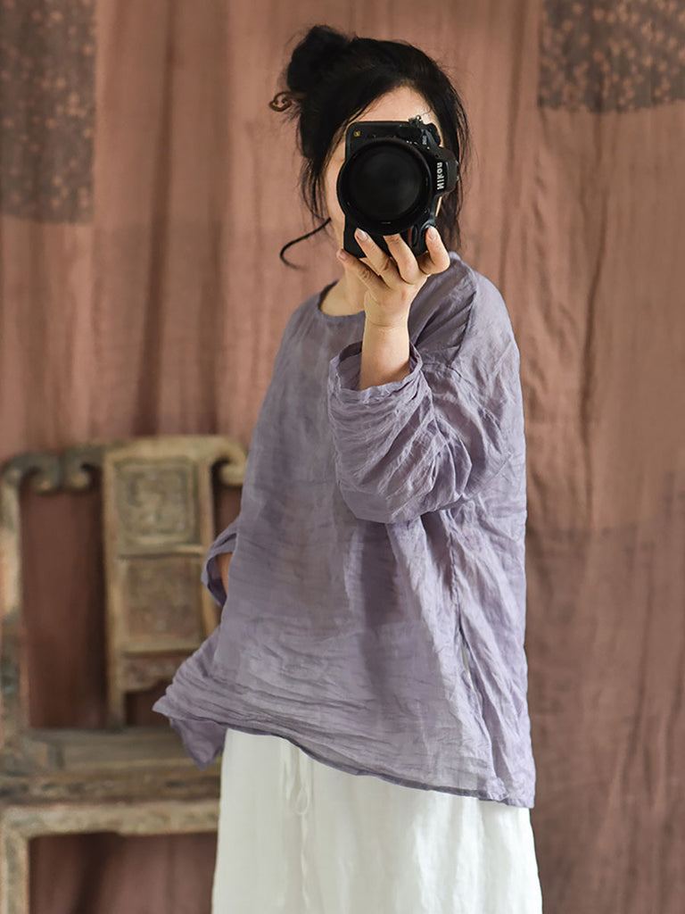 Plus Size Women Summer Solid Vintage O-Neck Split Hem Ramie Shirt