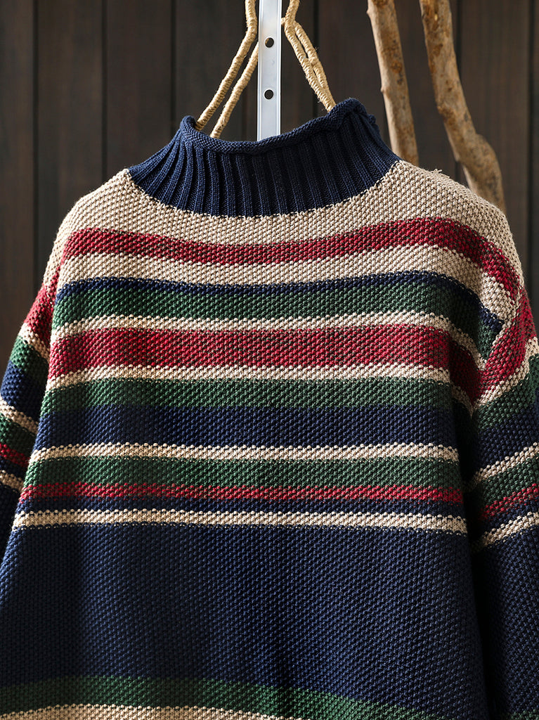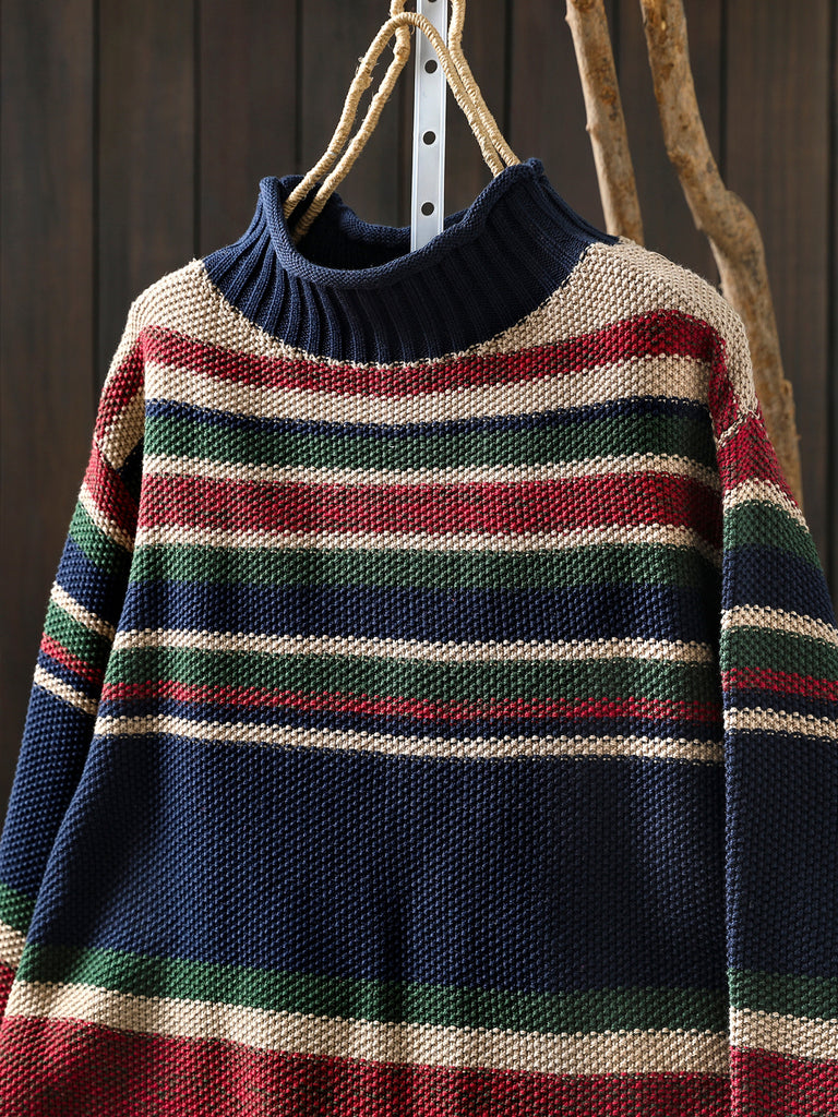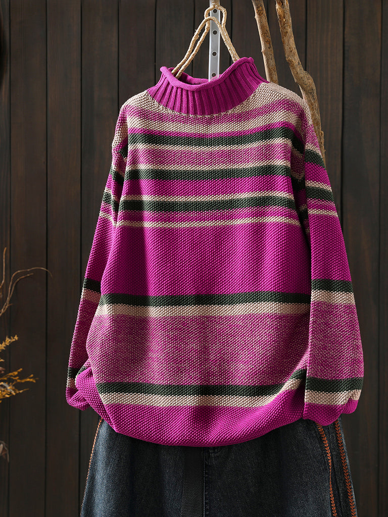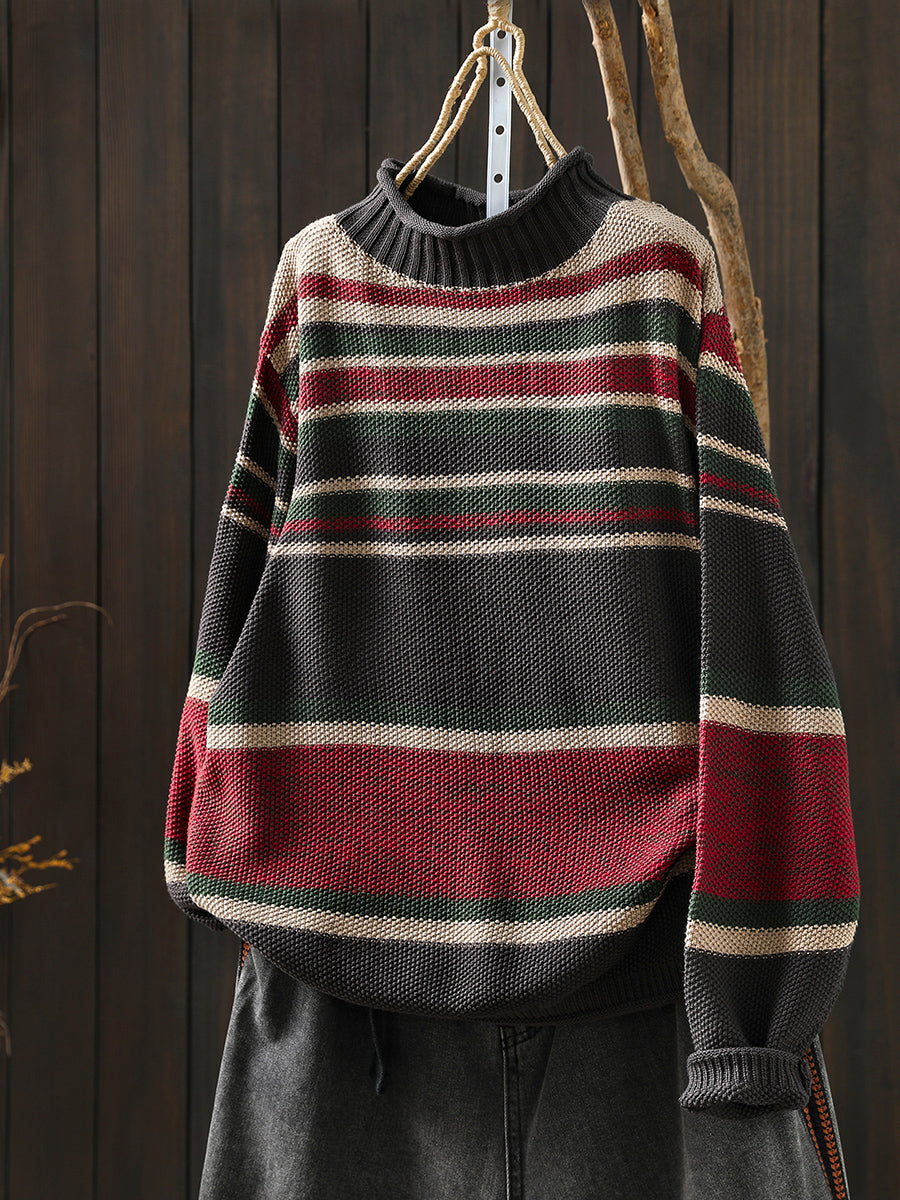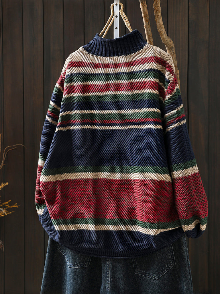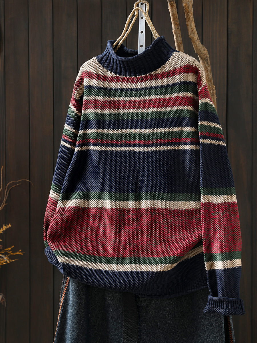Women Autumn Artsy Colorblock Stripe Half-Turtleneck Sweater