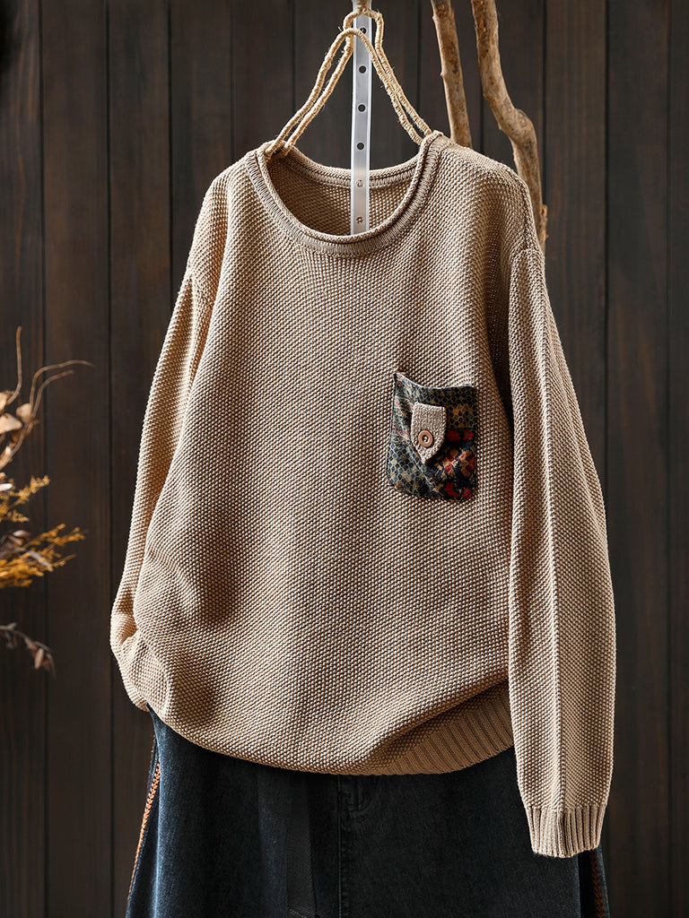 Women Autumn Artsy Patch Pocket Knitted O-Neck Sweater
